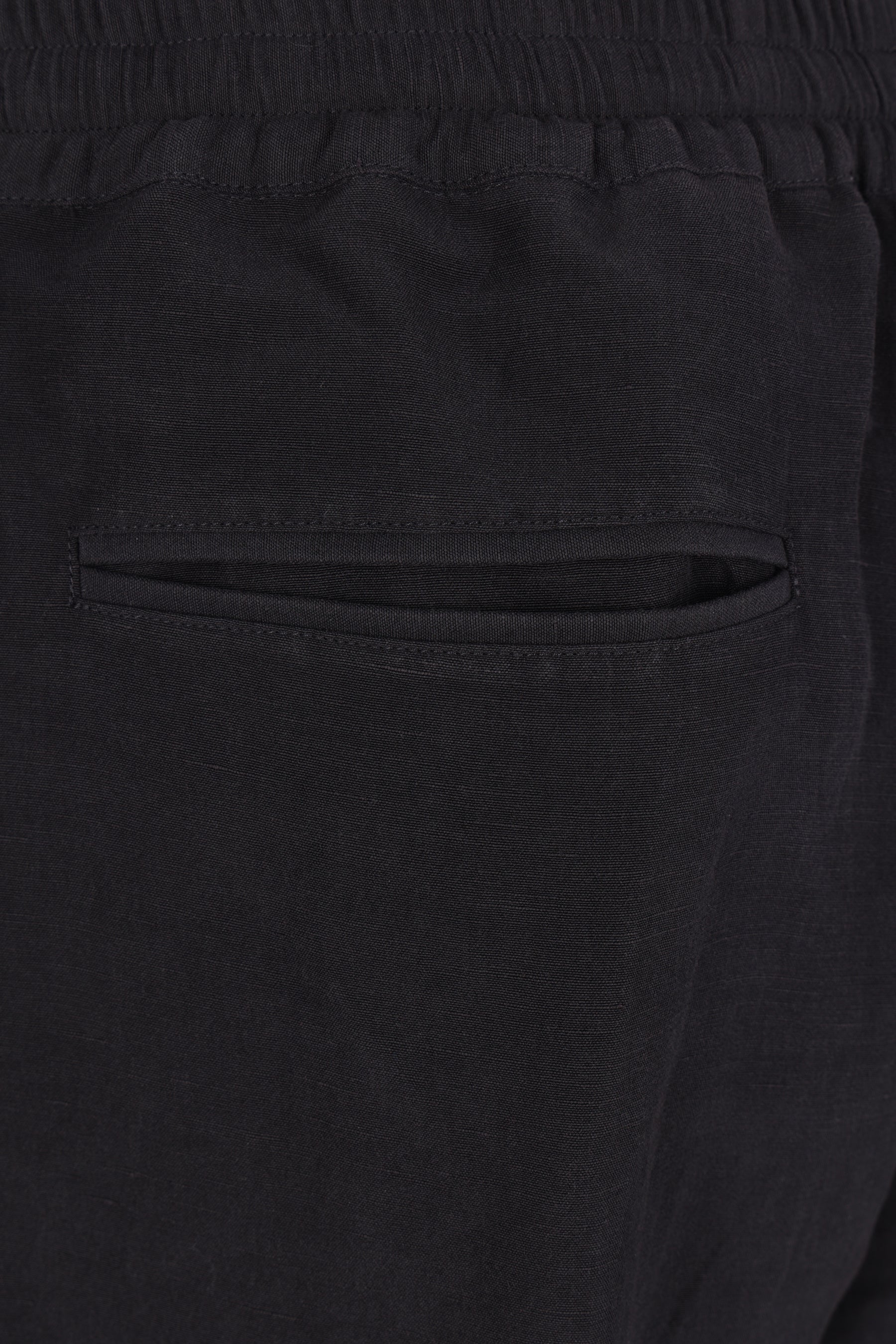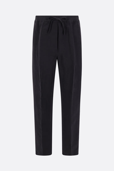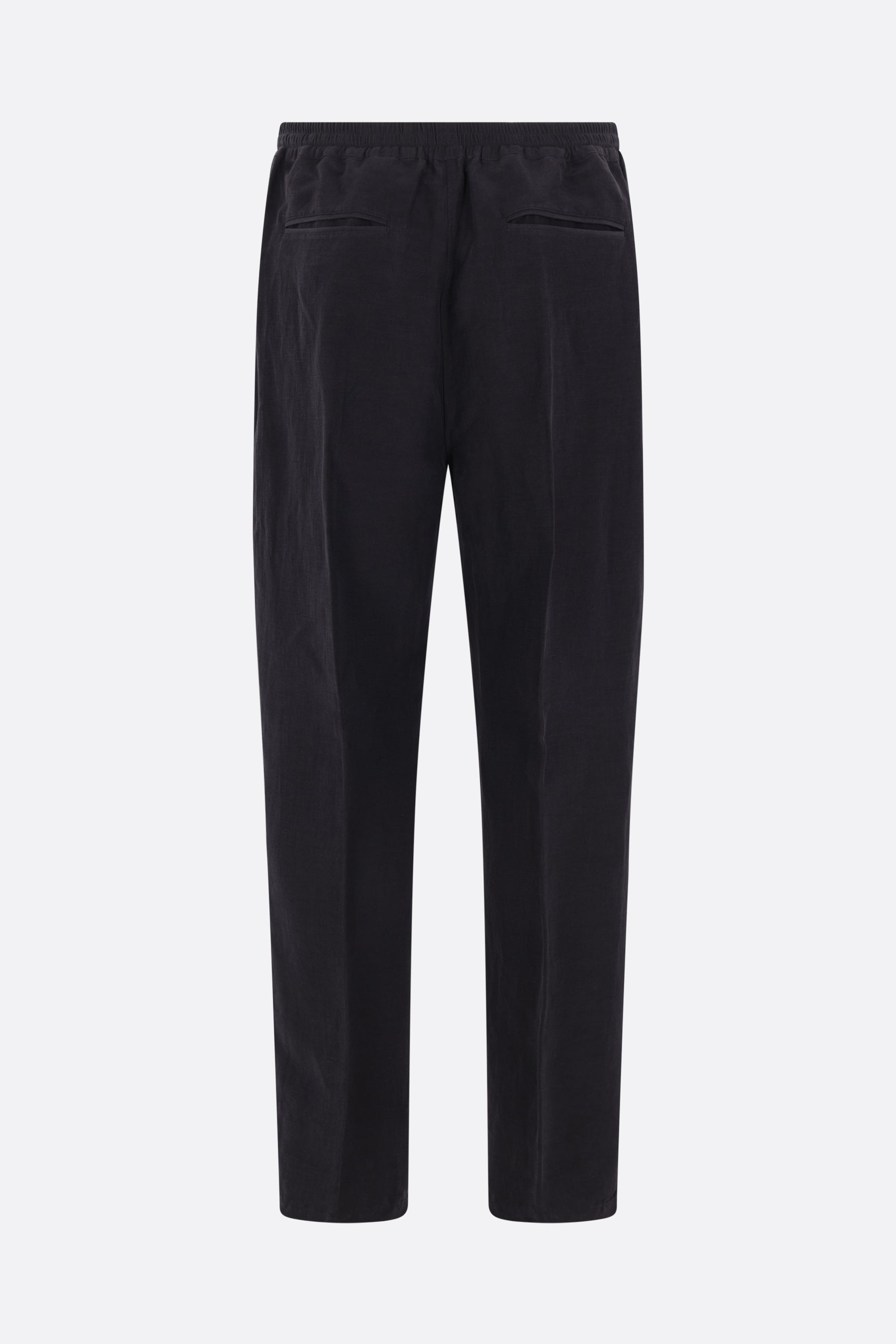 Umit Benan pants made of black linen and silk. Featuring an elastic waistband with drawstring and pockets on both sides.