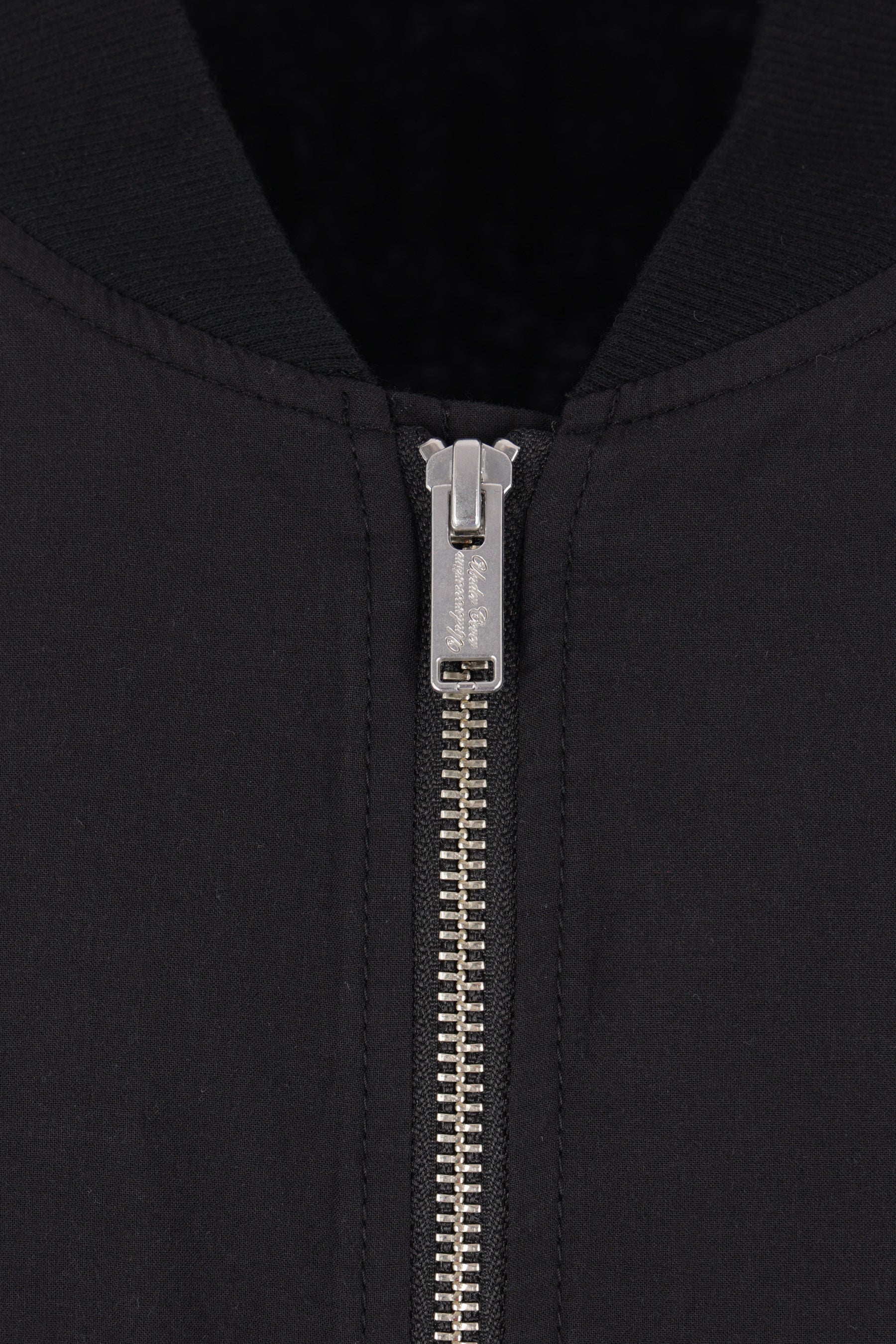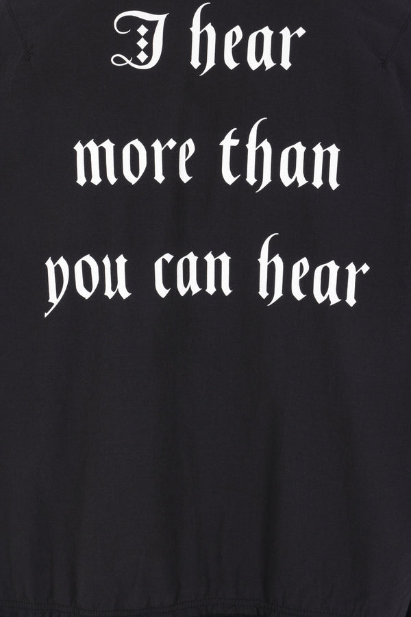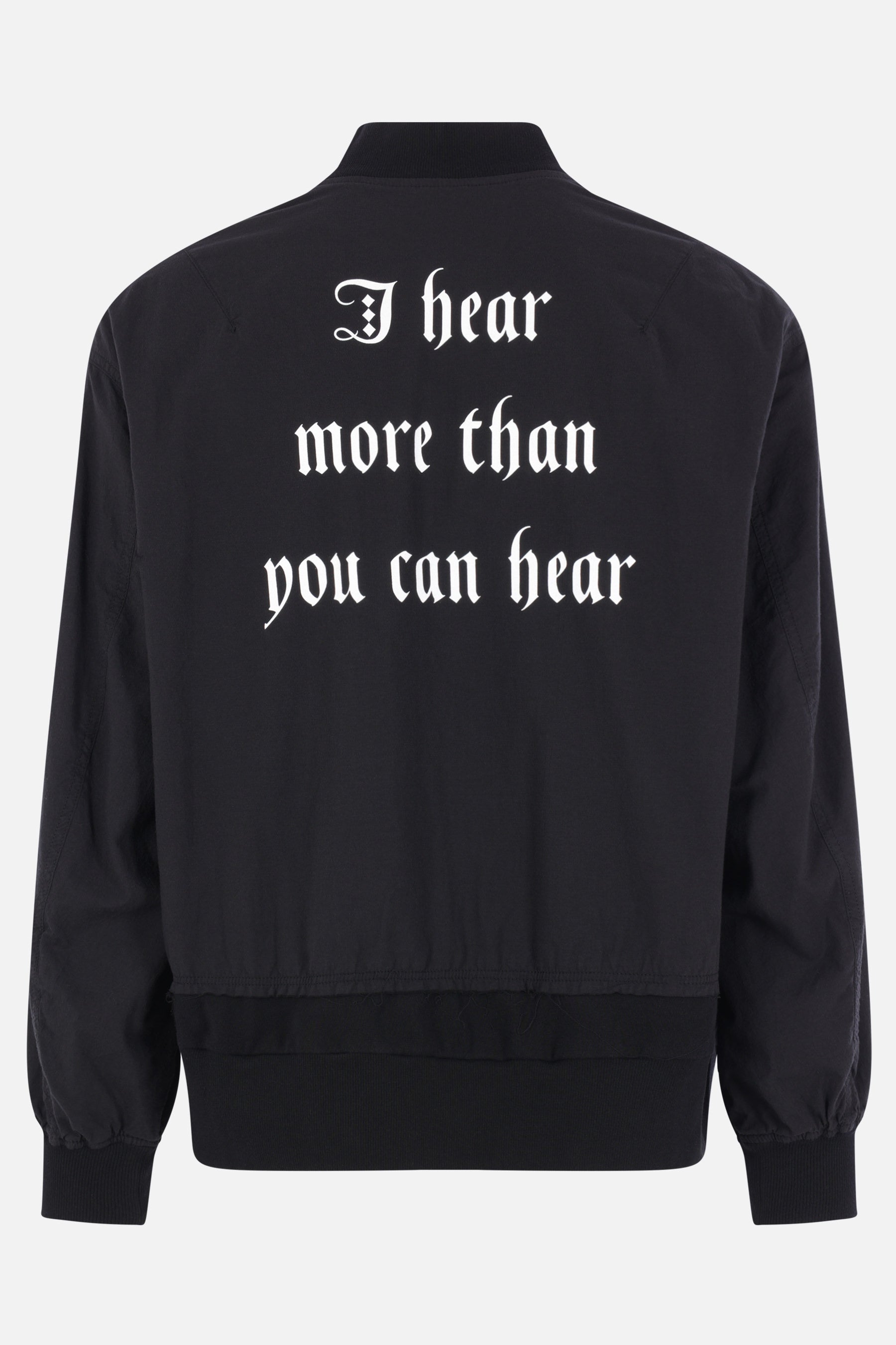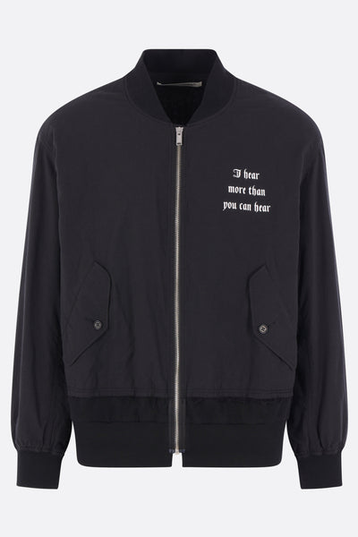 Undercover bomber jacket made of black cotton with lettering prints on the chest and back. Featuring a bomber collar, front zip closure, flap pockets, long sleeves, a jersey hem with frayed trim, and ribbed cuffs. The interior is lined.