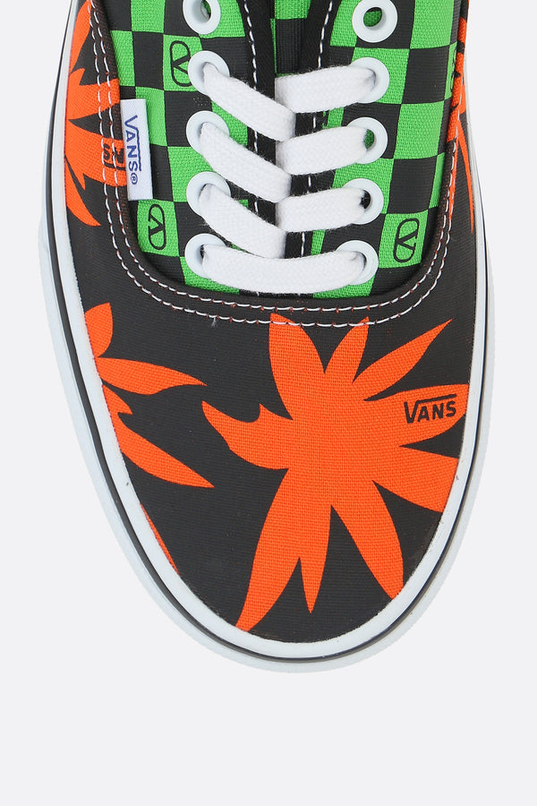 Valentino Garavani and Vans low-top sneakers crafted from canvas with VLogo Checkerboard and Tropical Leaves print. Featuring lace-up closure, rounded toe, fabric lining, and Vans Authentic Original rubber sole.
