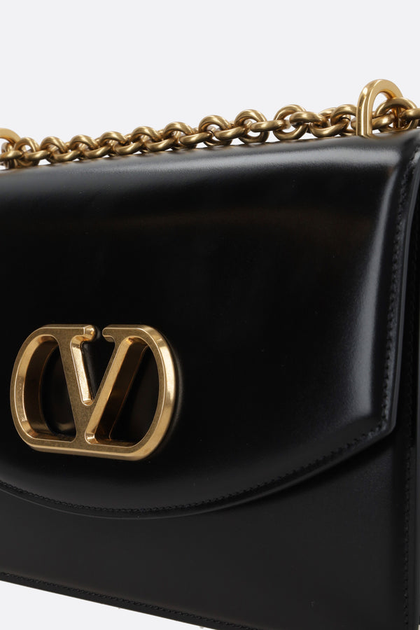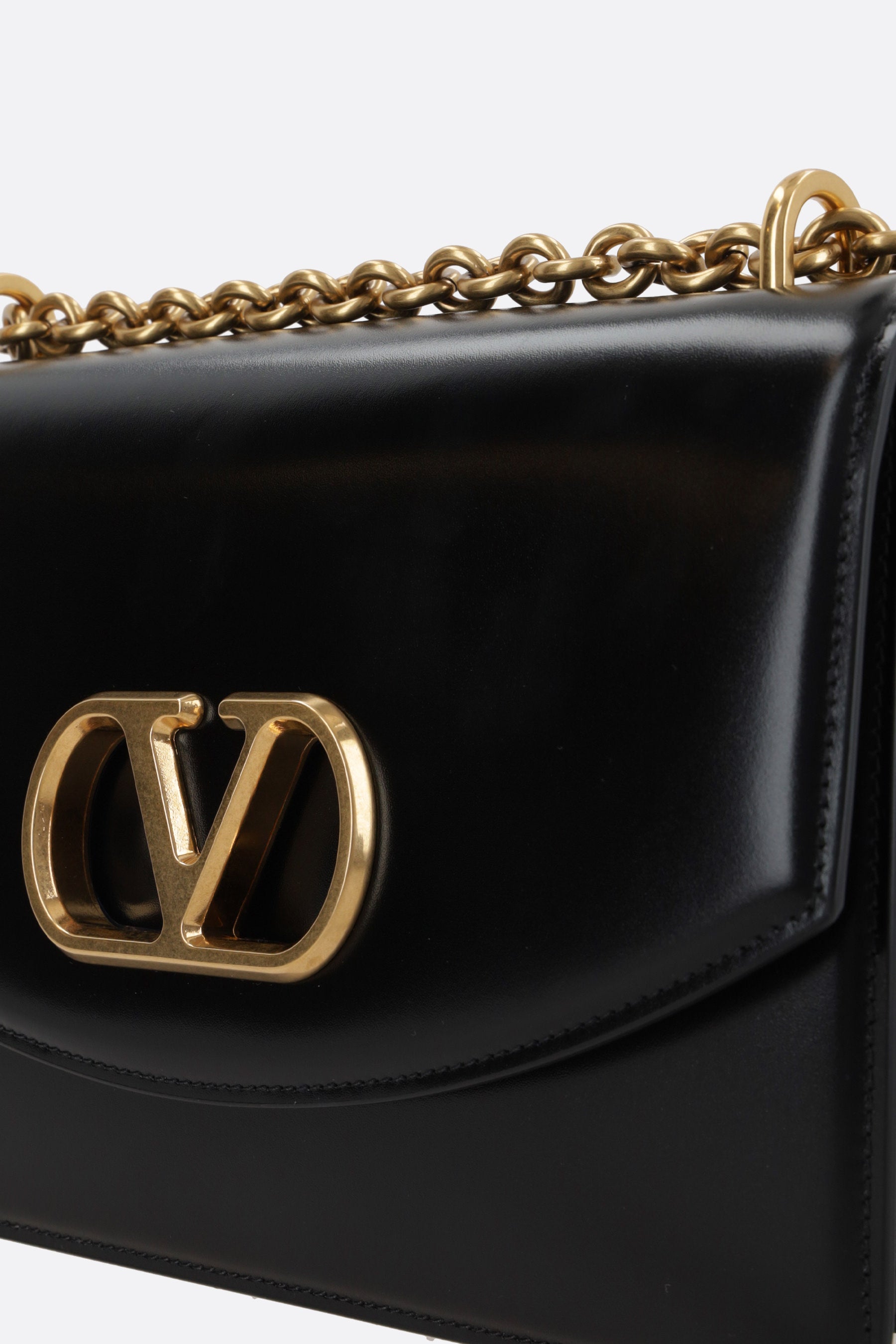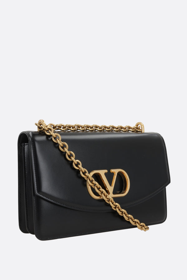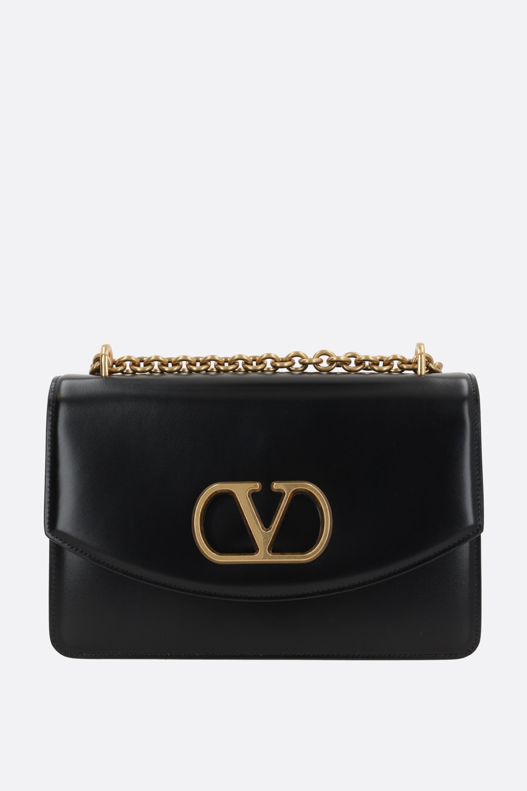 Valentino Garavani shoulder bag made of shiny black leather with metal VLogo Signature detail. Featuring antique gold-tone hardware, a magnetic button closure on the flap, and an adjustable chain shoulder strap with two lengths. The tone-on-tone leather-lined interior is equipped with two separate compartments, a zip pocket, and a card slot.