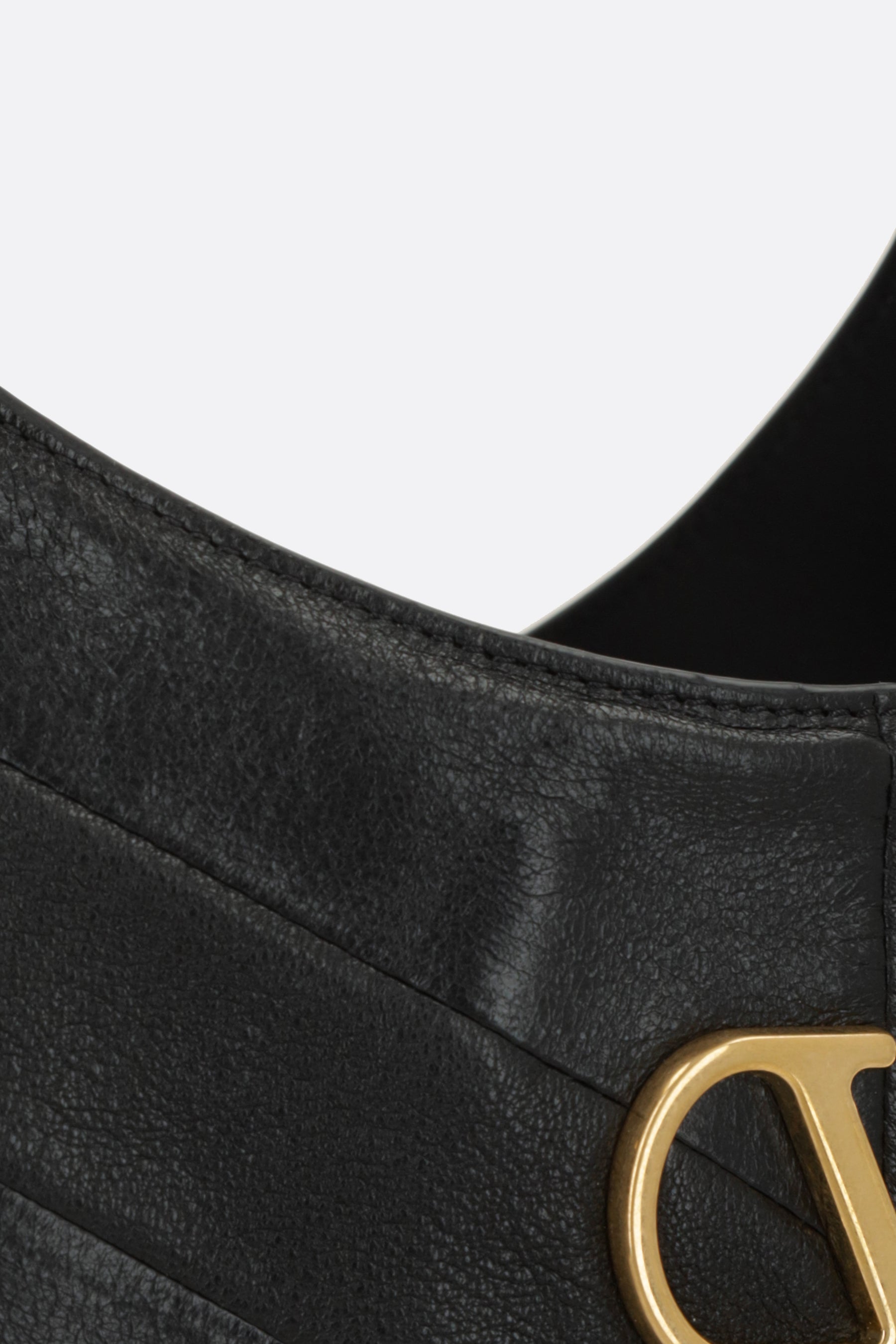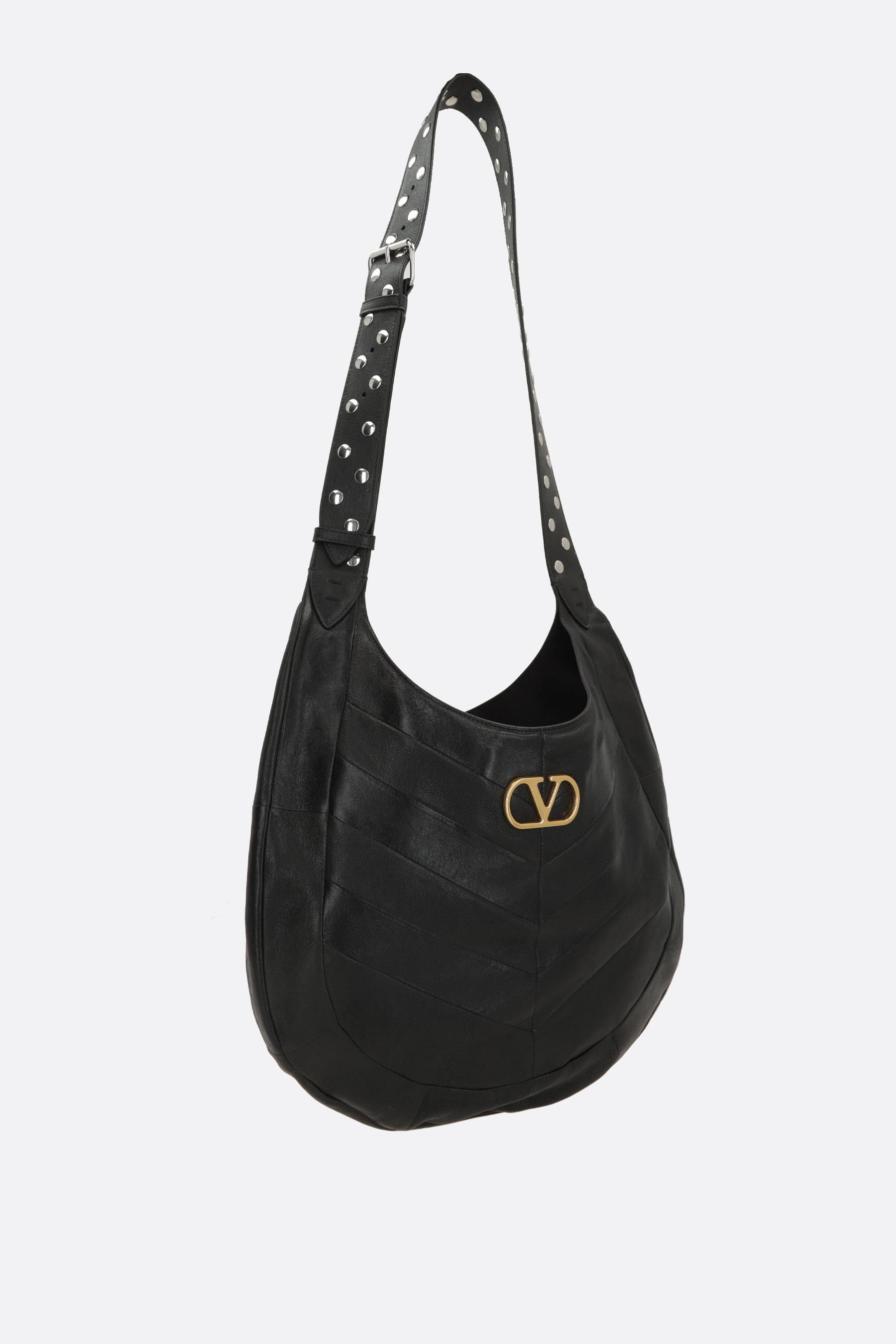 Valentino Garavani hobo bag crafted from a chevron-patterned patchwork of glossy and matte nappa leather. Features silver-toned hardware, adjustable studded shoulder strap, and a tone-on-tone nappa-lined interior. The design is completed with an antique gold-tone VLogo Signature detail.