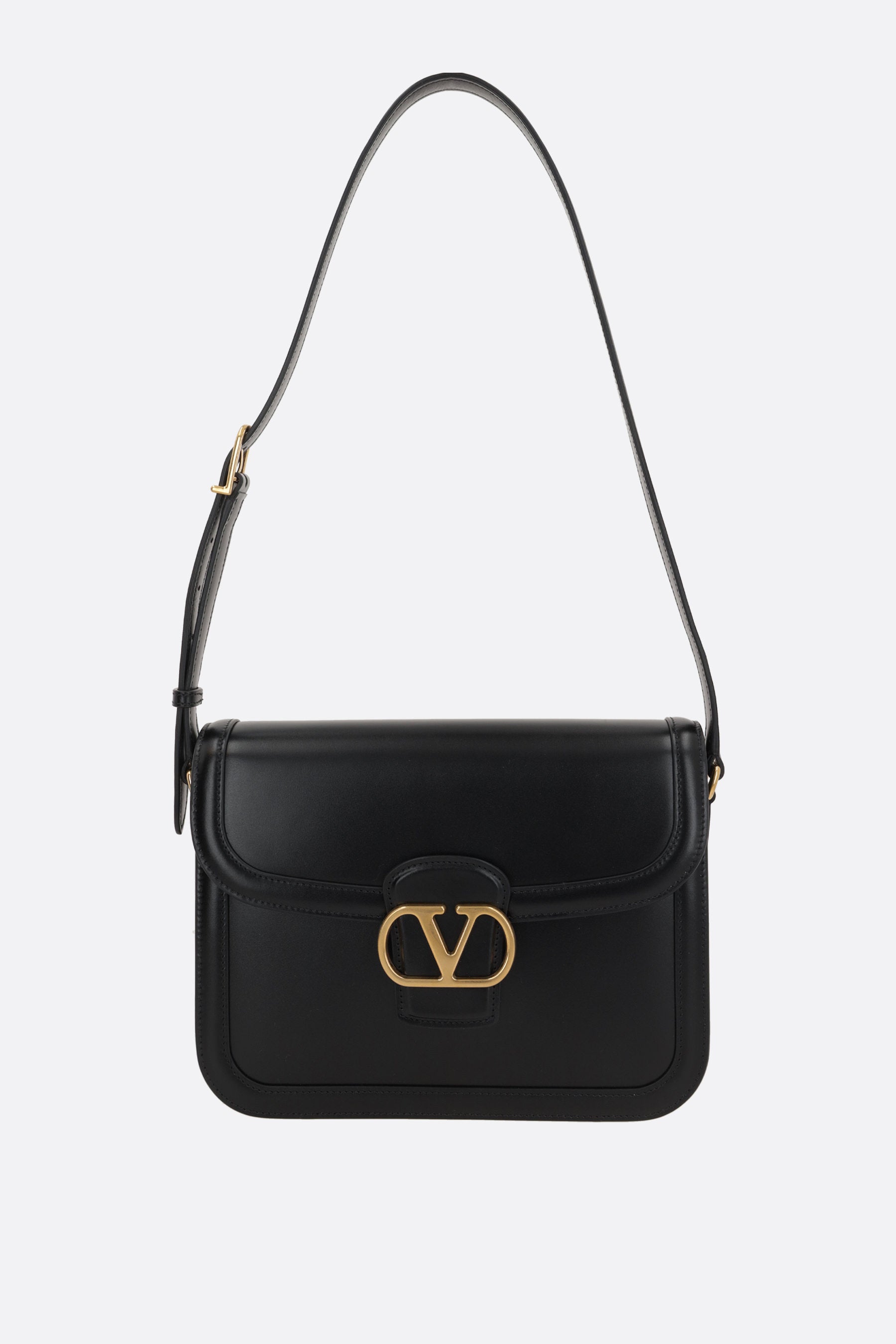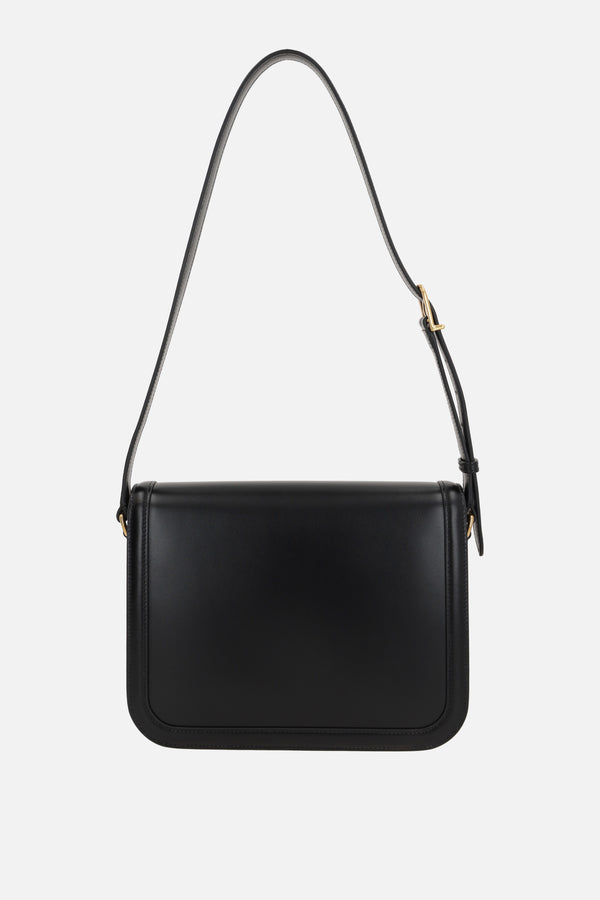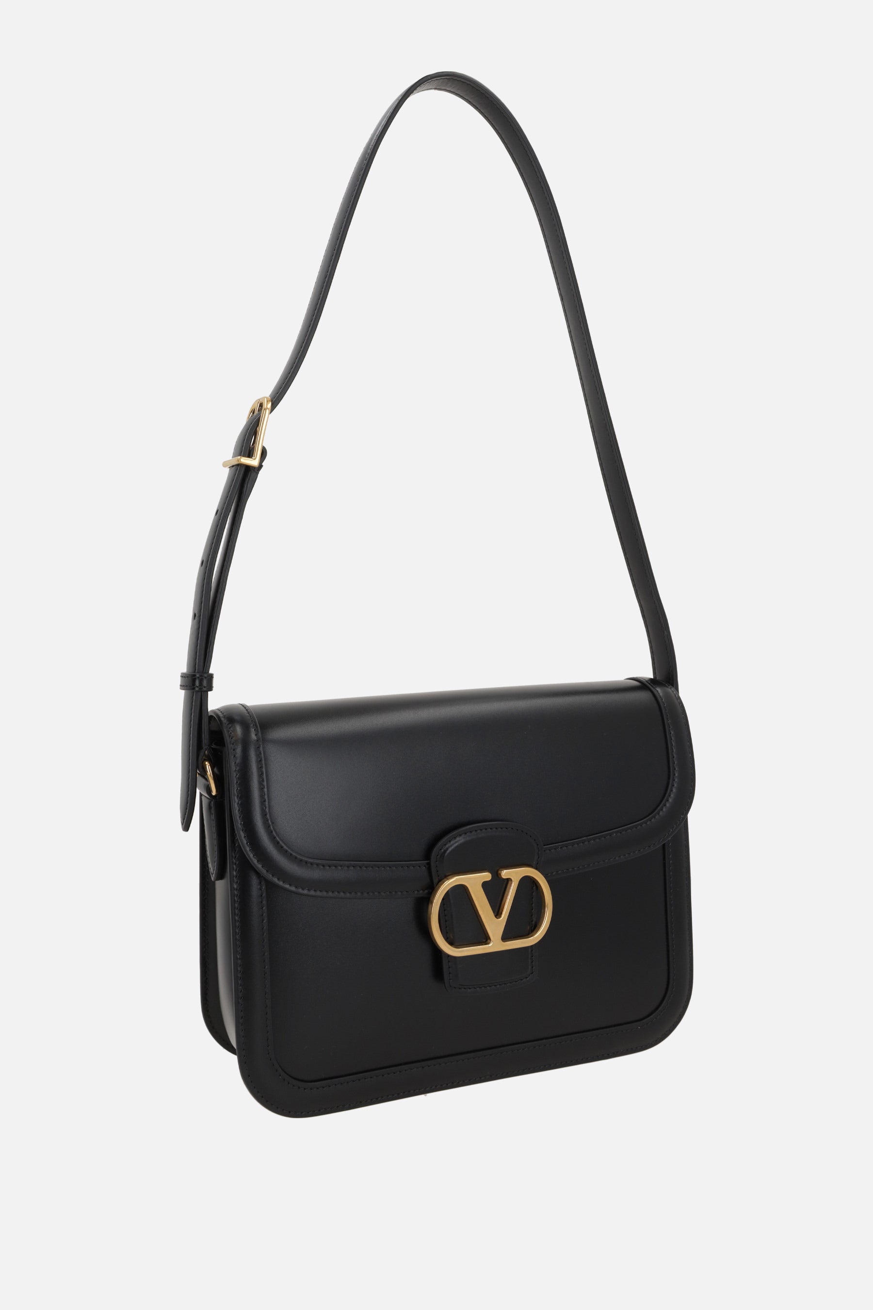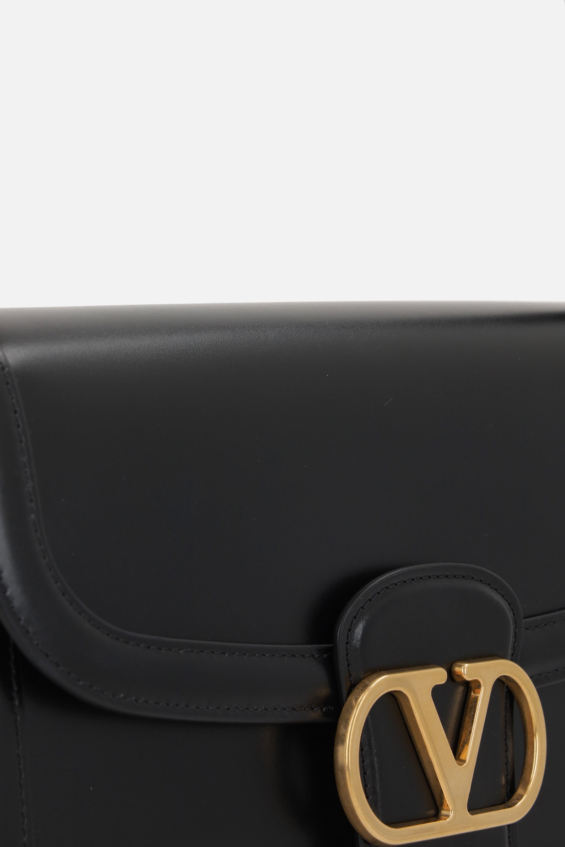 Valentino Garavani shoulder bag crafted in smooth black leather. Characterized by gold-tone hardware, magnetic button closure on the flap, and an adjustable shoulder strap. The black leather-lined interior features three separate compartments and a flat pocket. The design is completed with the iconic VLogo Signature metal detail.