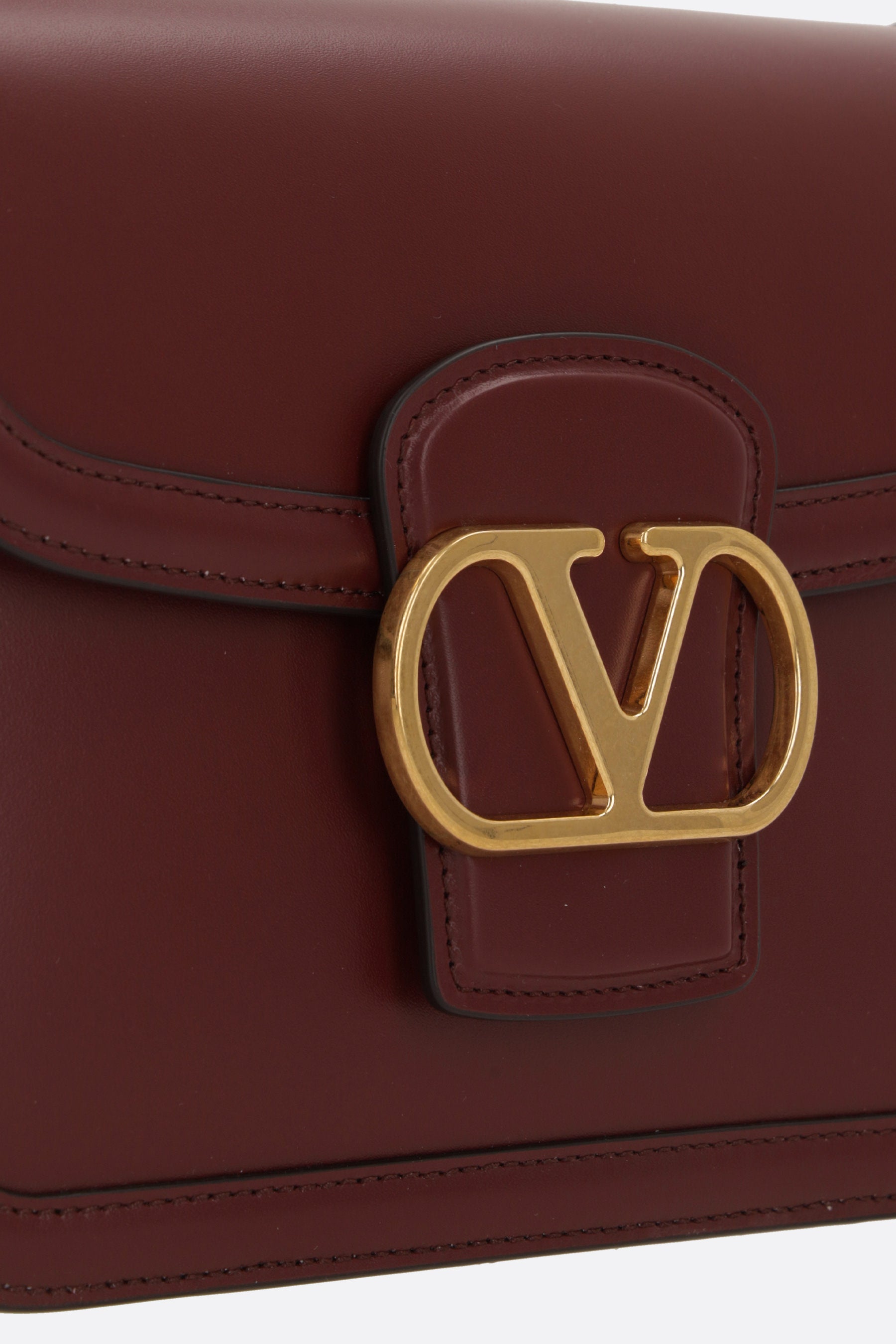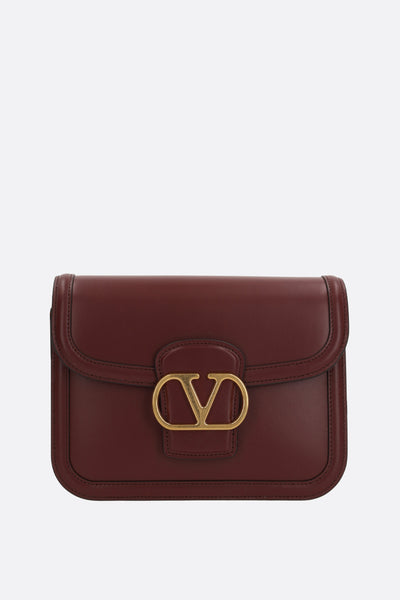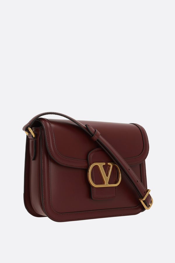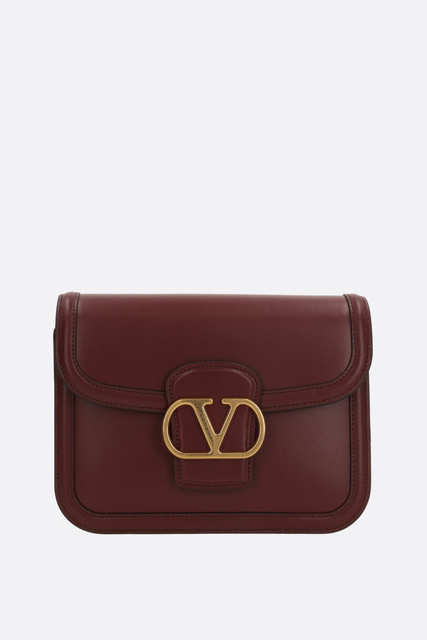 Valentino Garavani shoulder bag made of smooth ruby red leather. Featuring gold-tone hardware, magnetic button closure on the flap, and an adjustable strap. The tone-on-tone leather-lined interior includes three compartments and a flat pocket. The design is completed with the unmistakable VLogo Signature detail on the flap.