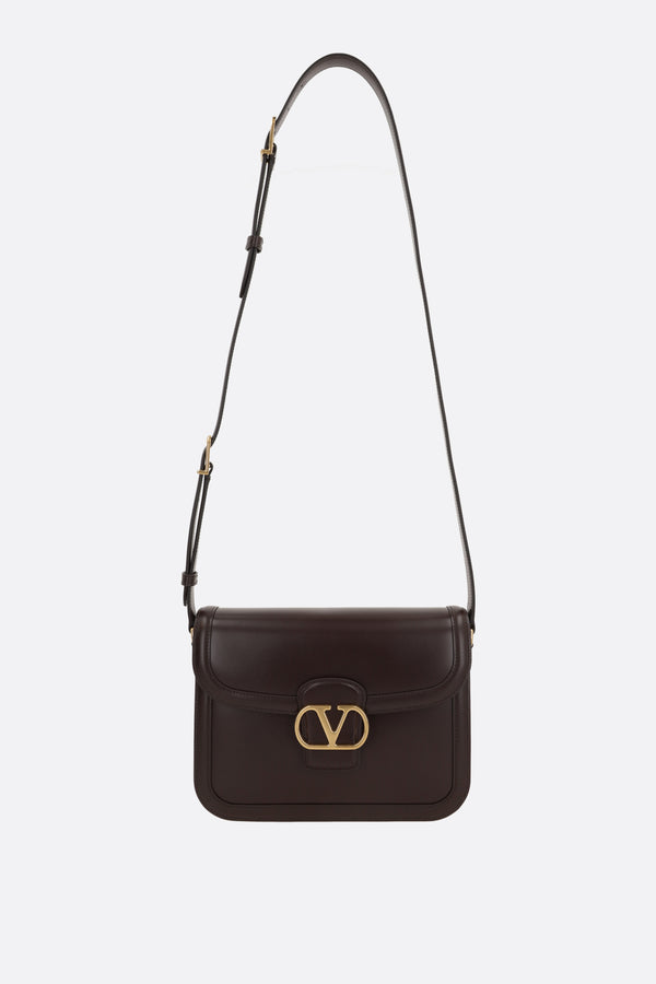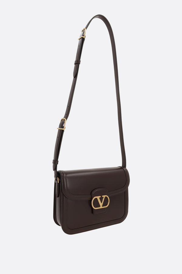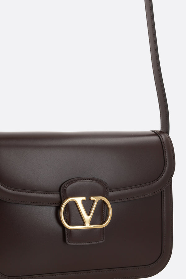 Valentino Garavani shoulder bag crafted in smooth dark brown leather. Characterized by gold-tone hardware, magnetic button closure on the flap, and an adjustable shoulder strap. The tone-on-tone leather-lined interior features three separate compartments and a flat pocket. The design is completed with the iconic VLogo Signature metal detail.