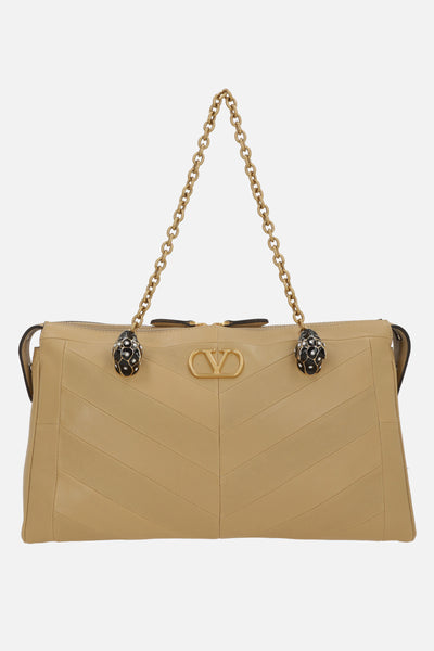 Valentino Garavani shoulder bag crafted from a chevron-patterned patchwork of glossy and matte nappa leather. Features gold-toned hardware, zip closure, chain handles, and an adjustable/removable shoulder strap. The tone-on-tone nappa-lined interior includes a zip pocket and card slot. The design is completed with enameled feline heads decorated with Swarovski® crystals and an antique gold-tone VLogo Signature detail.