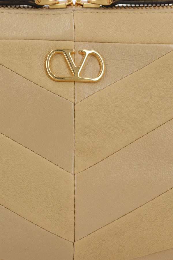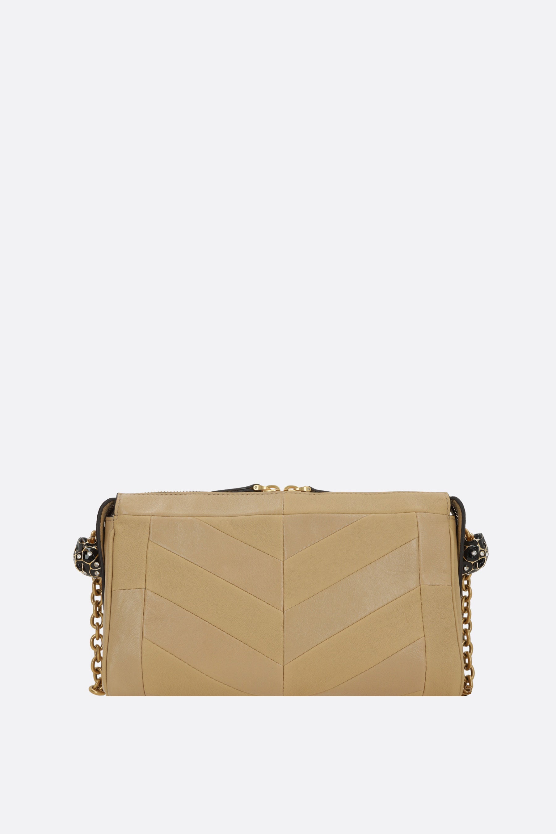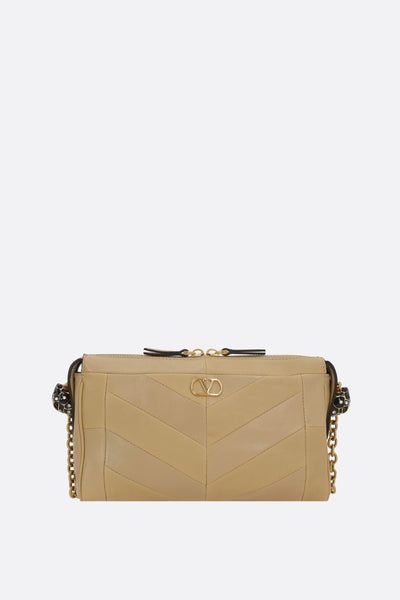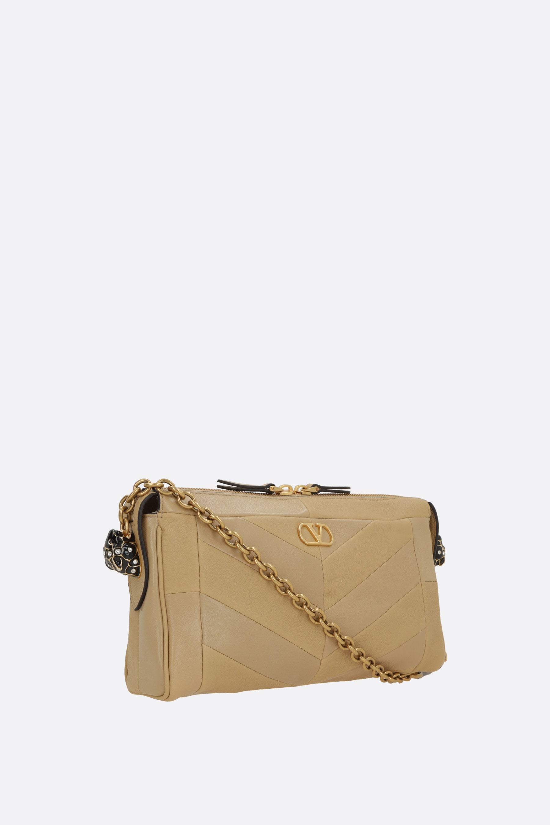 Valentino Garavani shoulder bag crafted from a patchwork of glossy and matte nappa leather in a chevron pattern. Featuring gold-tone hardware, double-zip closure, and an adjustable shoulder strap with chain inserts. The tone-on-tone nappa-lined interior includes a zip pocket and card slot. The design is completed with enameled feline heads adorned with Swarovski® crystals and the antique gold-tone metal VLogo Signature detail.