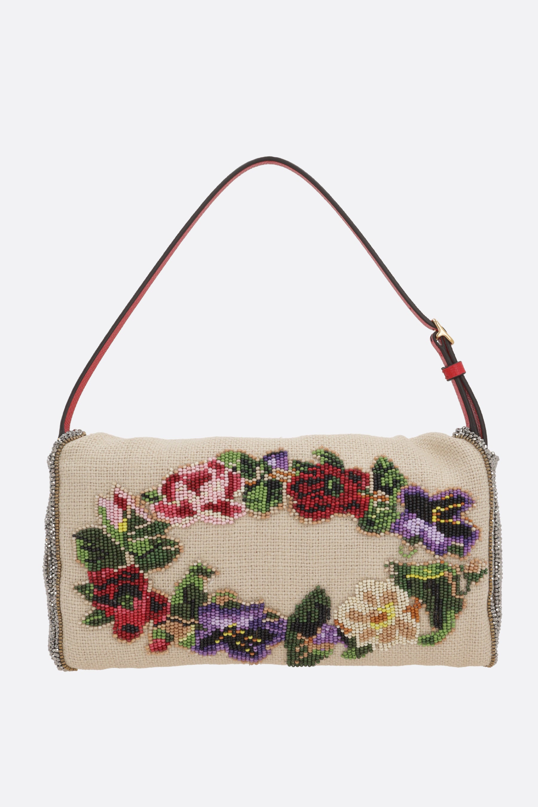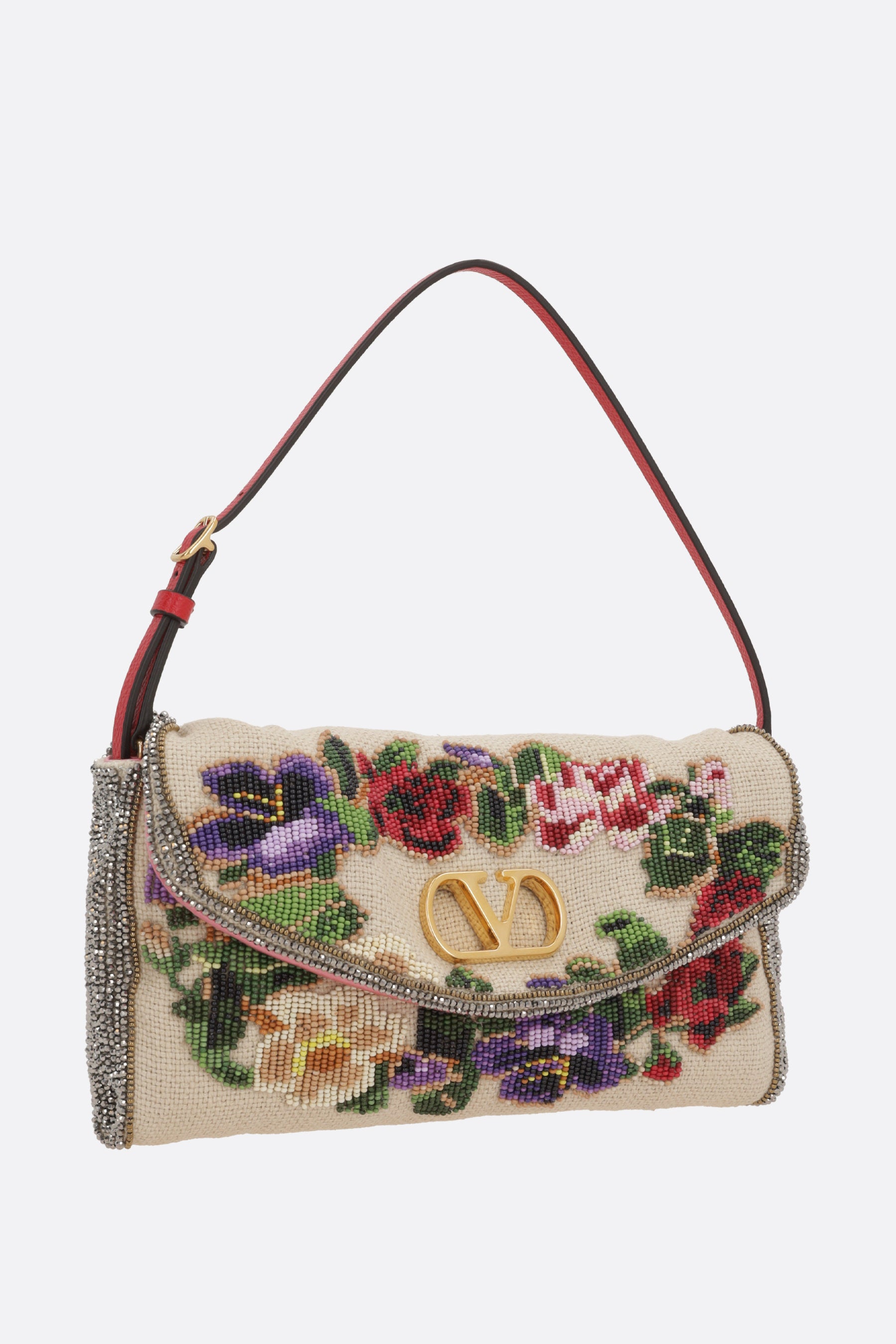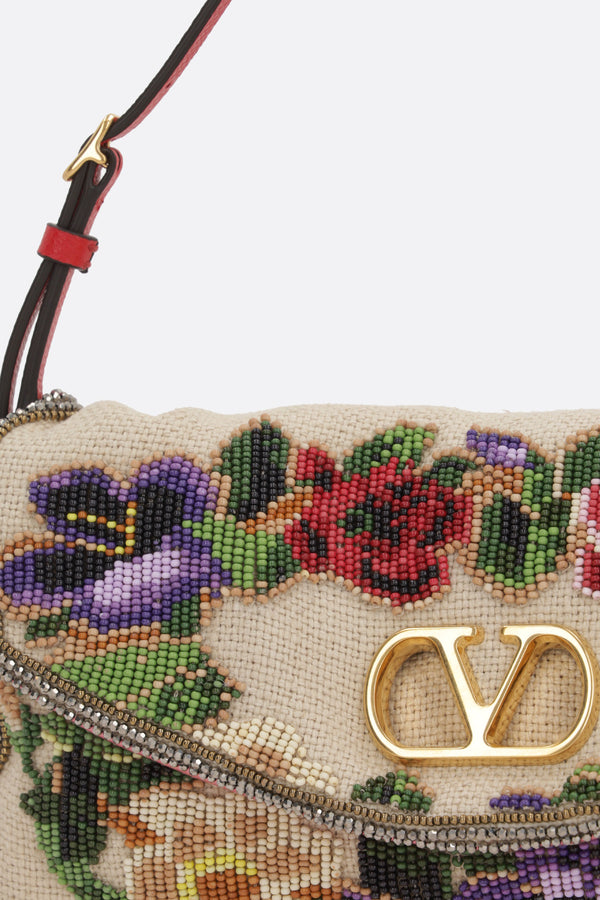 Valentino Garavani shoulder bag crafted in natural linen, featuring floral bead embroidery and a metallic VLogo Signature detail. It is characterized by gold-tone hardware, a magnetic button closure on the flap, and an adjustable leather handle. The interior, lined in pink satin, includes a card slot.