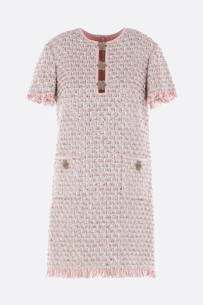 Valentino Garavani mini dress made of Ribbon Tweed with floral embroidery. Featuring a crew neckline, back invisible zip closure, front patch pockets, short sleeves, straight hem, fringed edges, and a jacquard-lined interior with Flower, Stripe, and VLogo motifs.