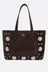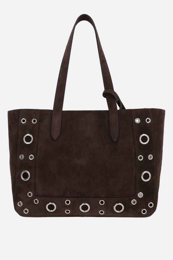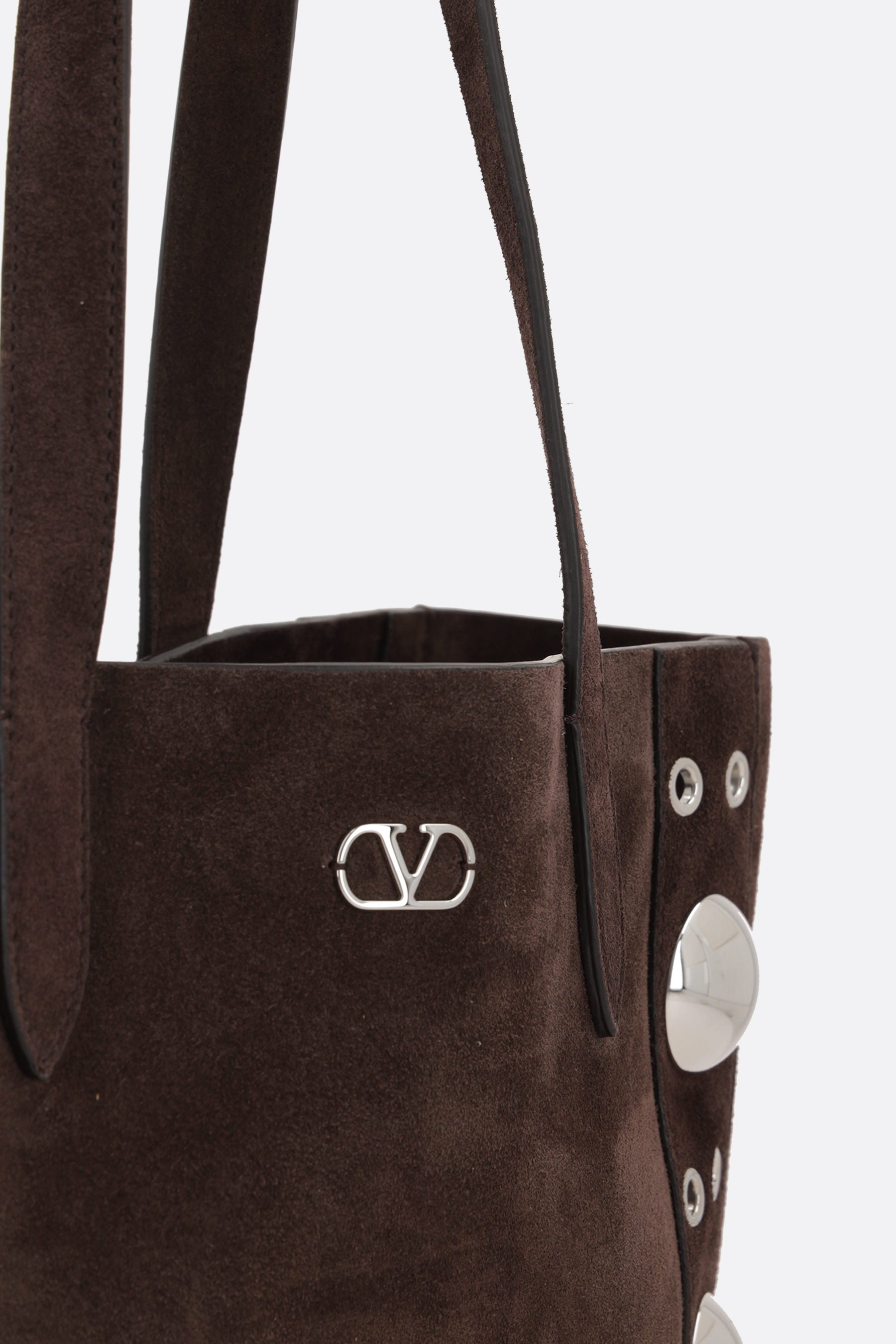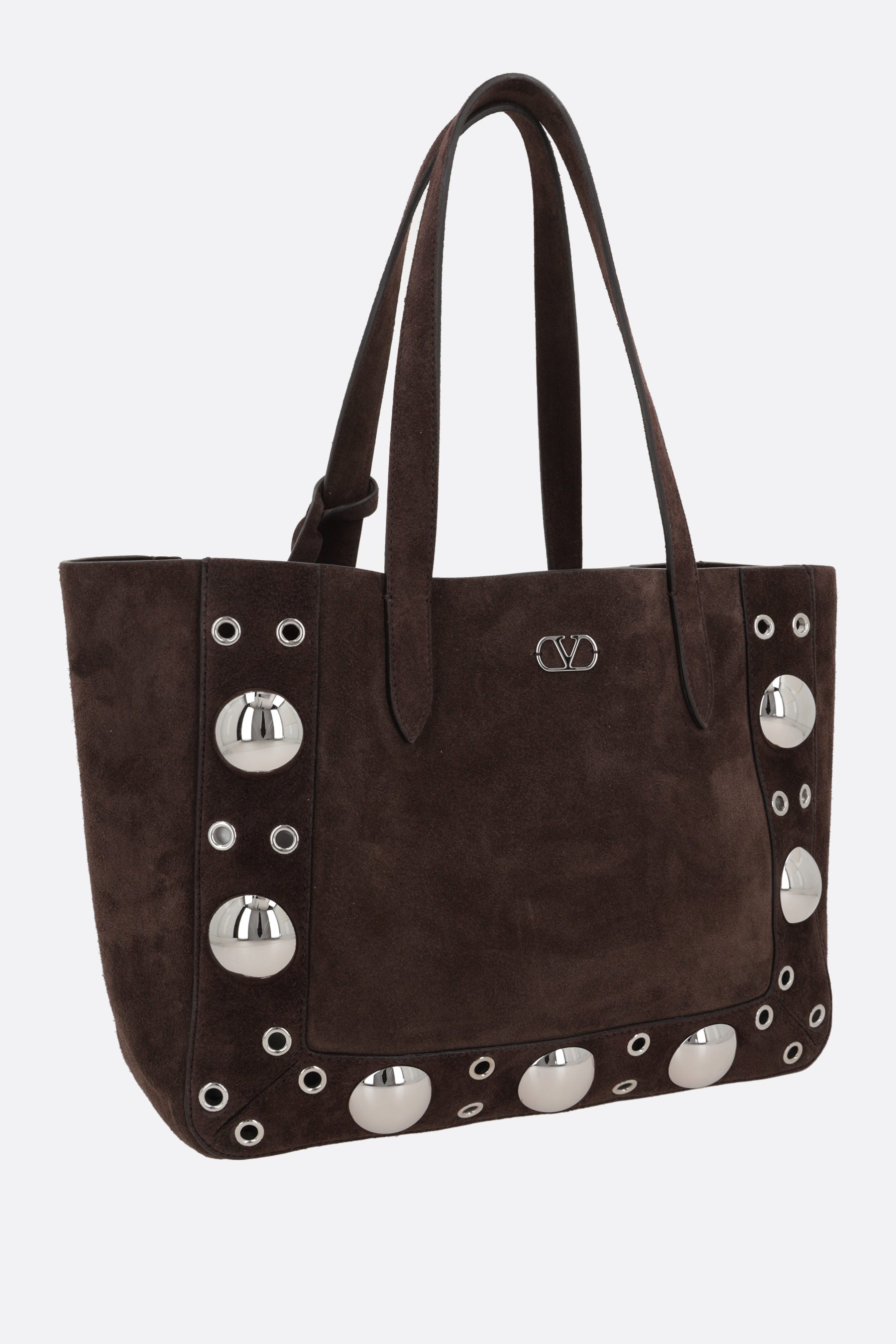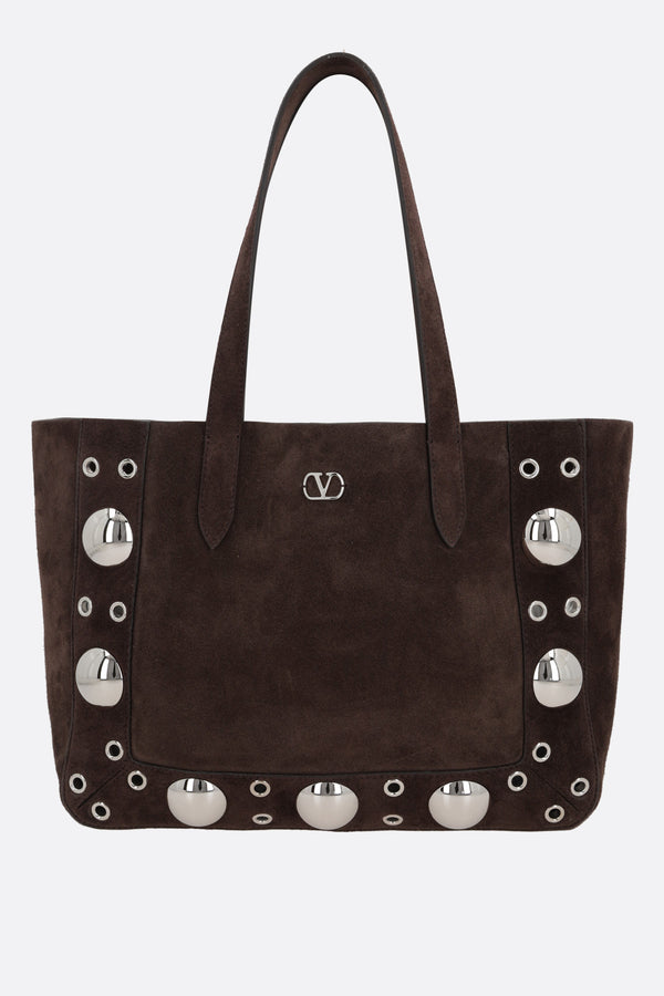 Valentino Garavani tote bag made of dark brown suede with spherical studs and rivets along the edges. Featuring silver-tone metal hardware and double handles. The tone-on-tone suede-lined interior includes a matching zip pouch. The design is completed by the iconic metal VLogo Signature detail applied on the front.