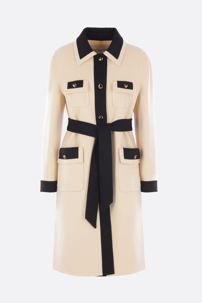 Valentino Garavani single-breasted coat crafted from ivory wool and cashmere with contrasting trims. Featuring a pointed collar, front button closure, contrasting belt, multiple pockets, long sleeves, a central back vent, and an unlined interior.