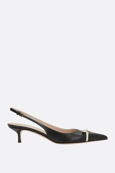 Valentino Garavani slingbacks crafted from black leather with a tone-on-tone patent toe, accented with a contrasting bow and antique gold-tone metal VLogo Signature detail. Featuring a pointed toe, adjustable ankle strap with metal buckle, leather lining, and leather sole. The design is completed with a covered kitten heel.