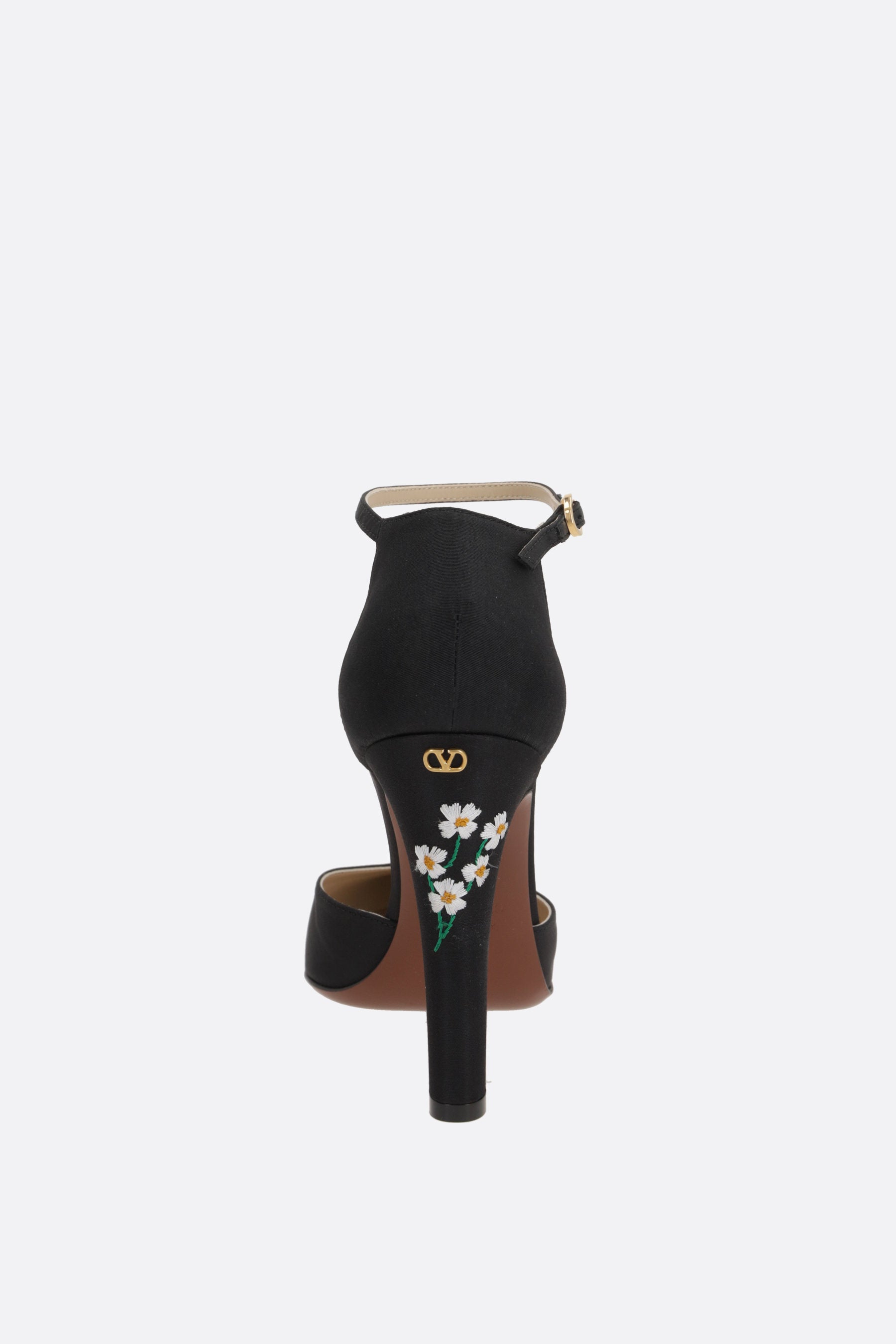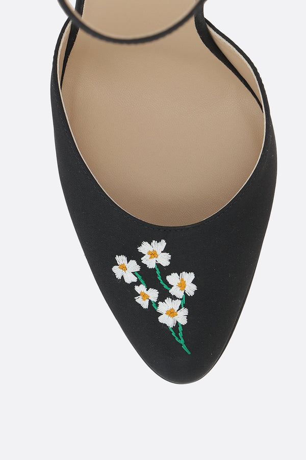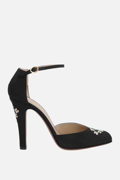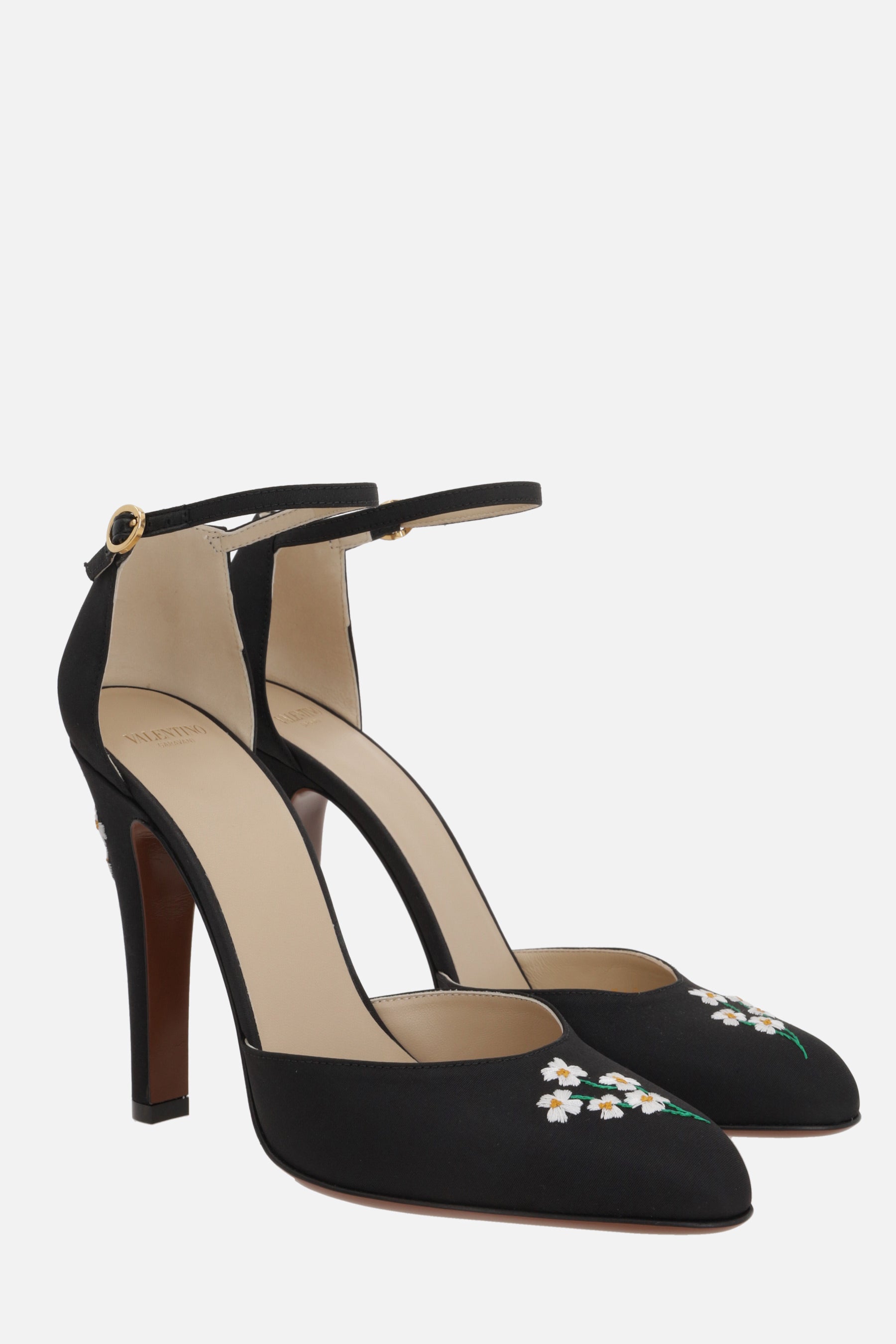 Valentino Garavani pumps crafted from black shantung fabric with floral embroidery. Featuring an almond toe, adjustable ankle strap with metal buckle, leather lining, and leather sole. The design is completed with an embroidered covered heel and a metal VLogo Signature detail.