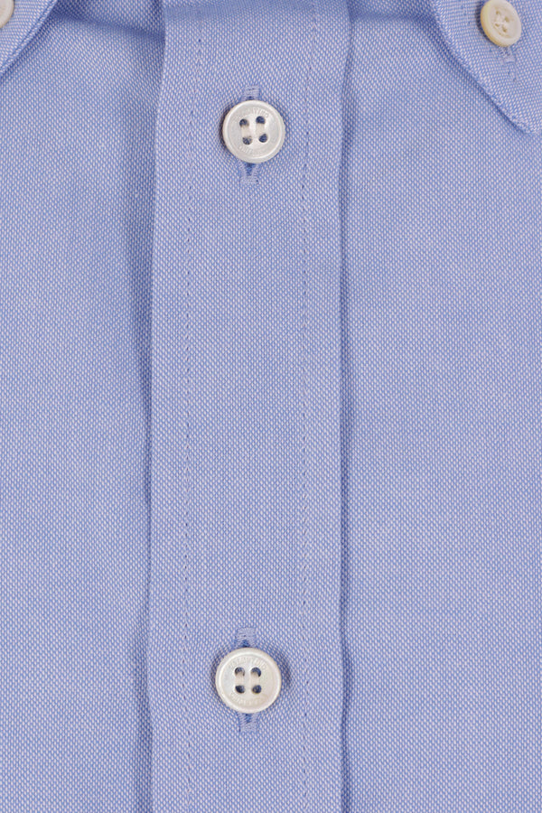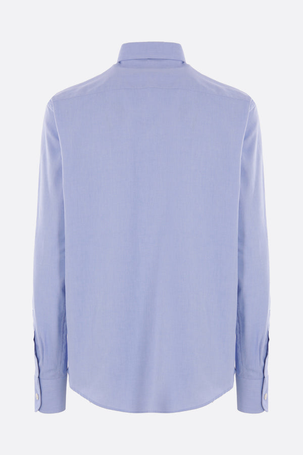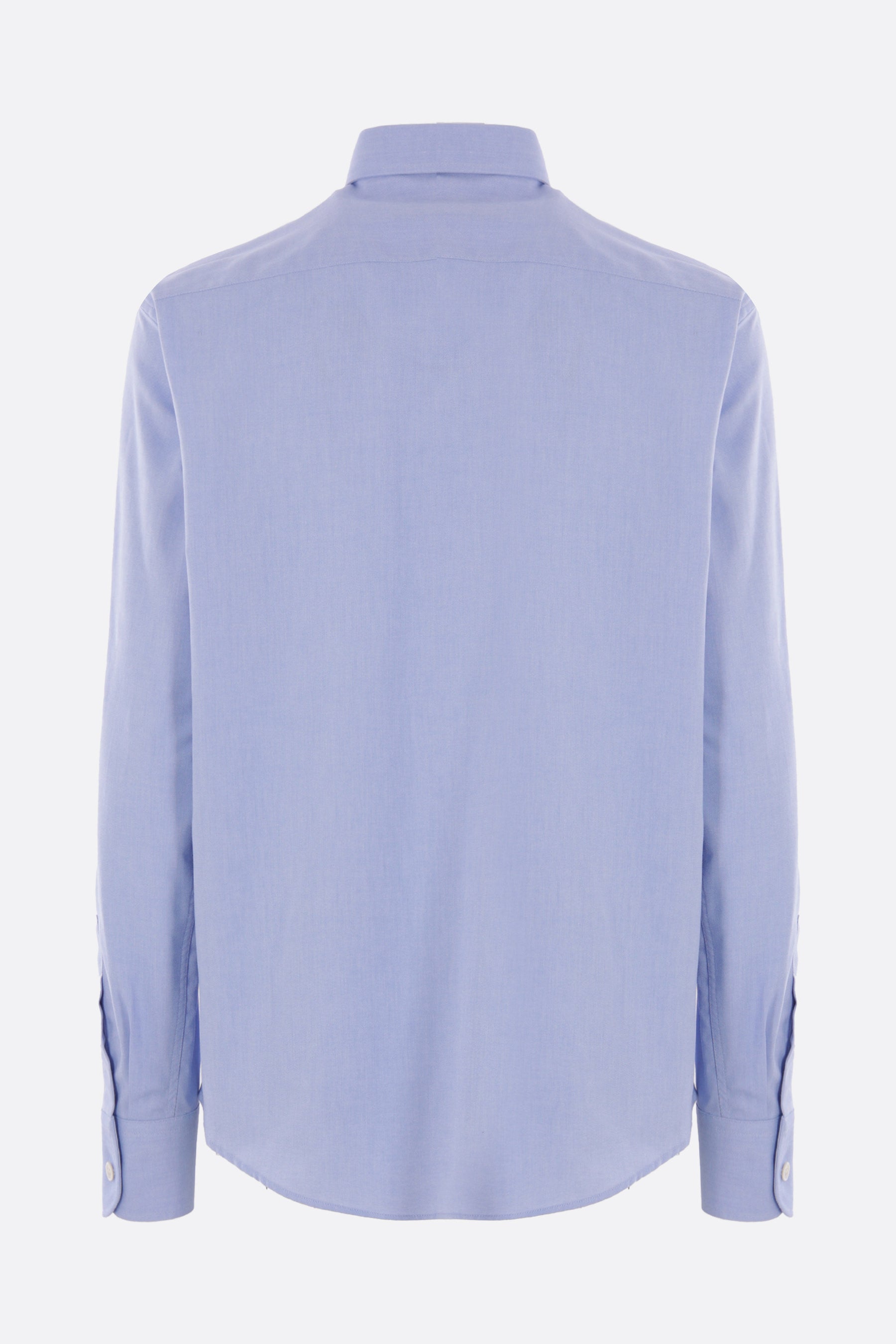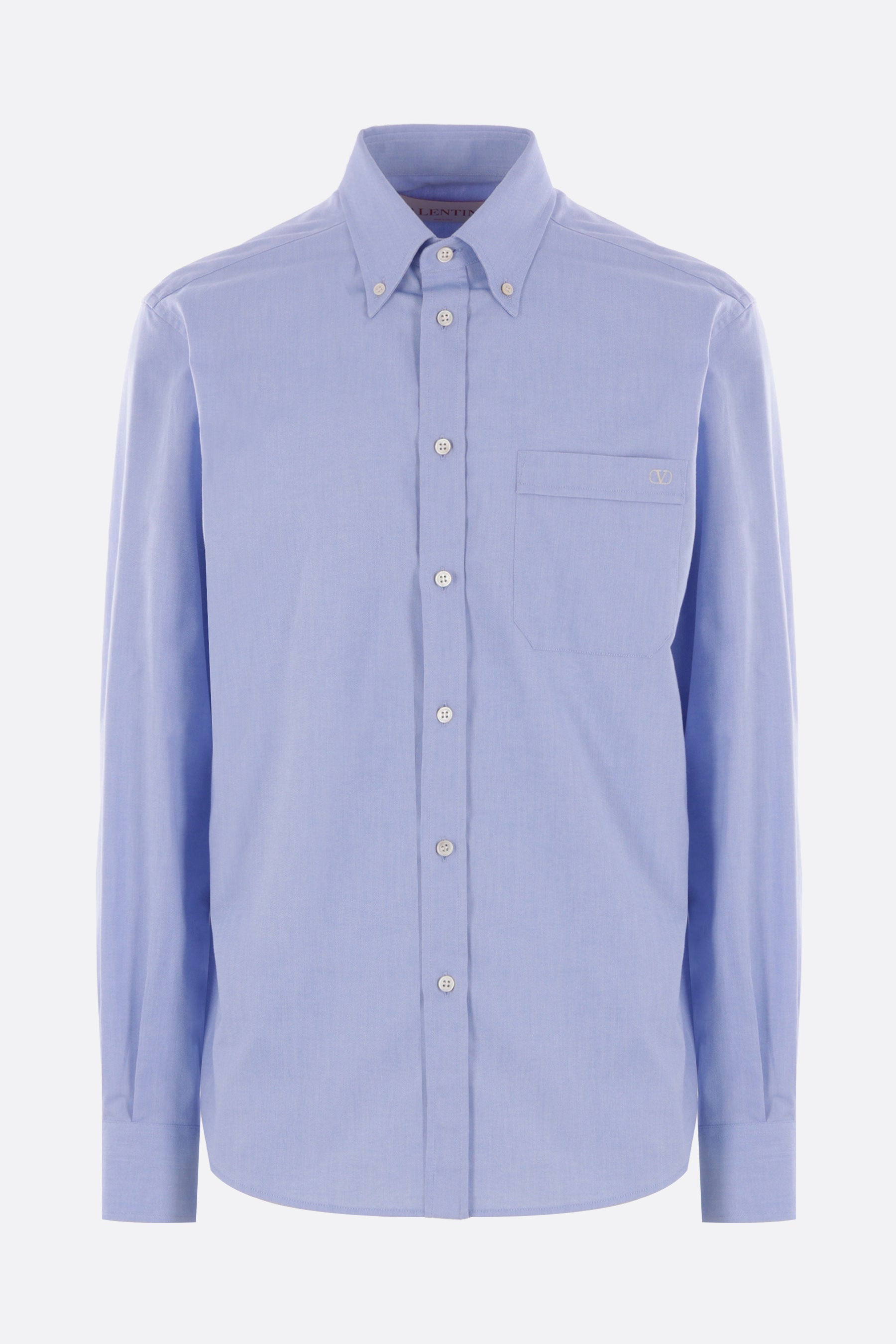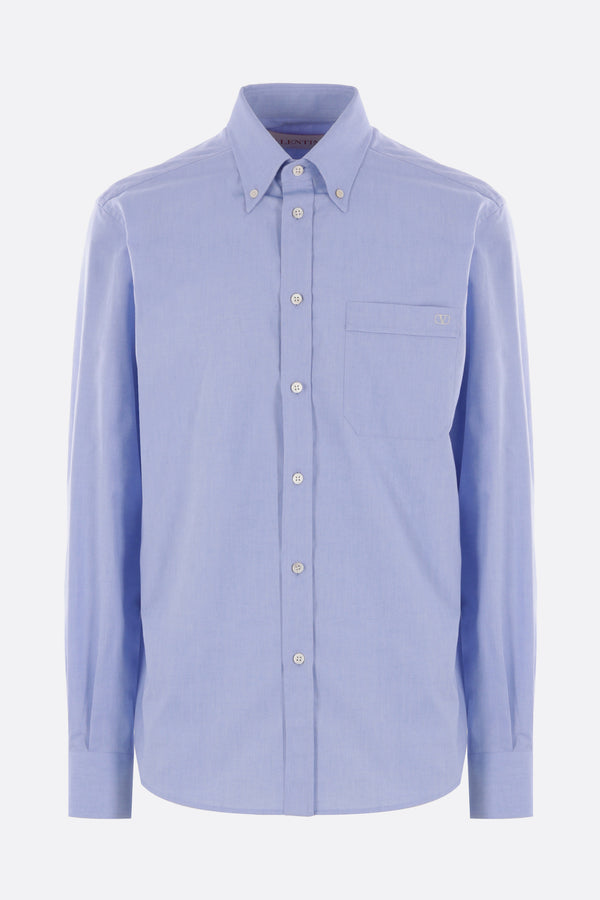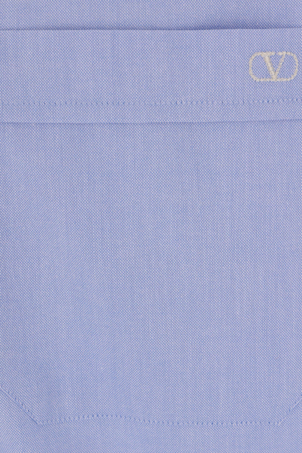 Valentino Garavani shirt crafted from light blue cotton Oxford. Featuring a button-down collar, front button closure, a chest patch pocket with VLogo embroidery, long sleeves with buttoned cuffs, and a rounded hem.