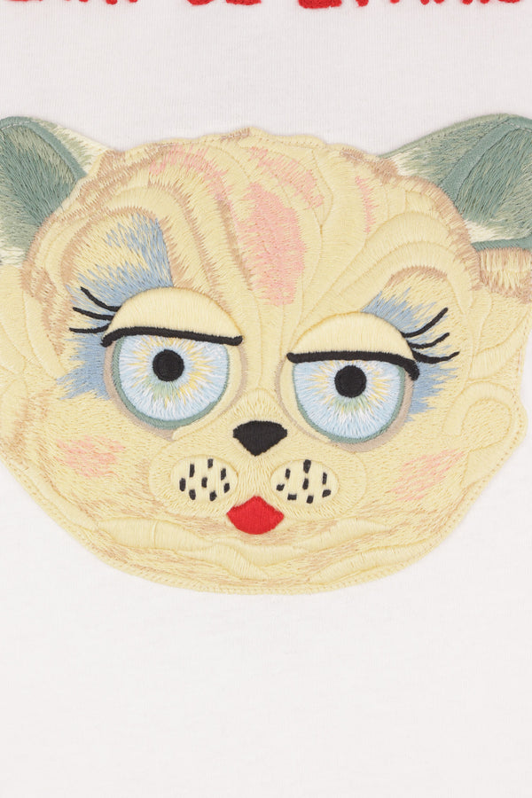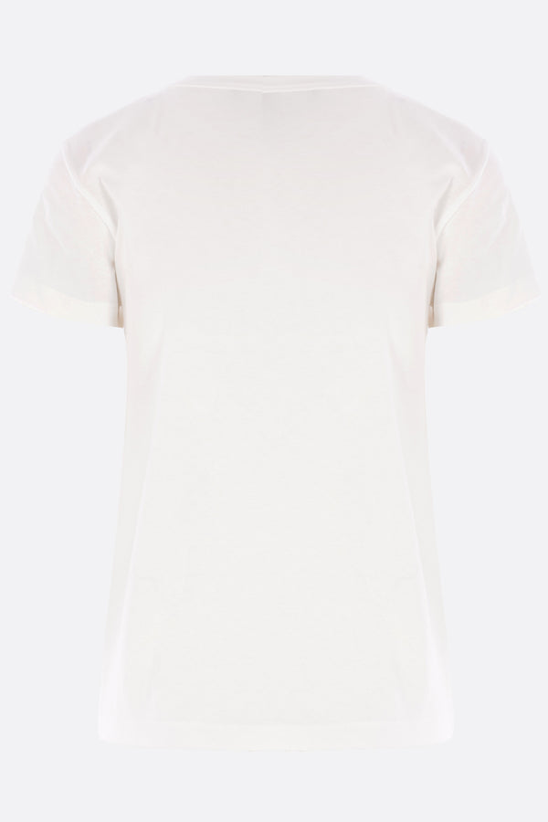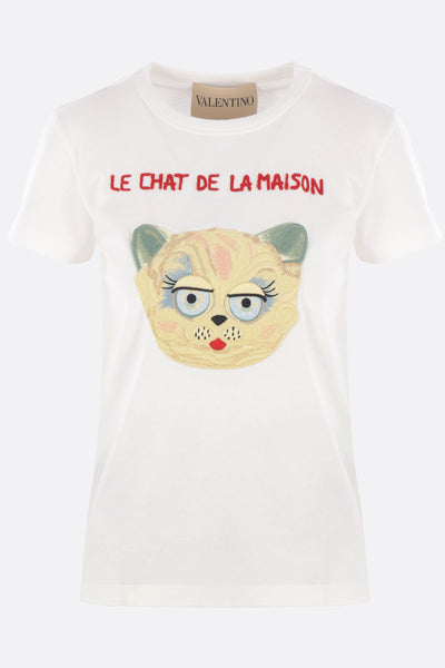 Valentino Garavani t-shirt made from white cotton jersey with a front-applied Chat de la Maison patch. Features a crew neckline, short sleeves, and a straight hem.