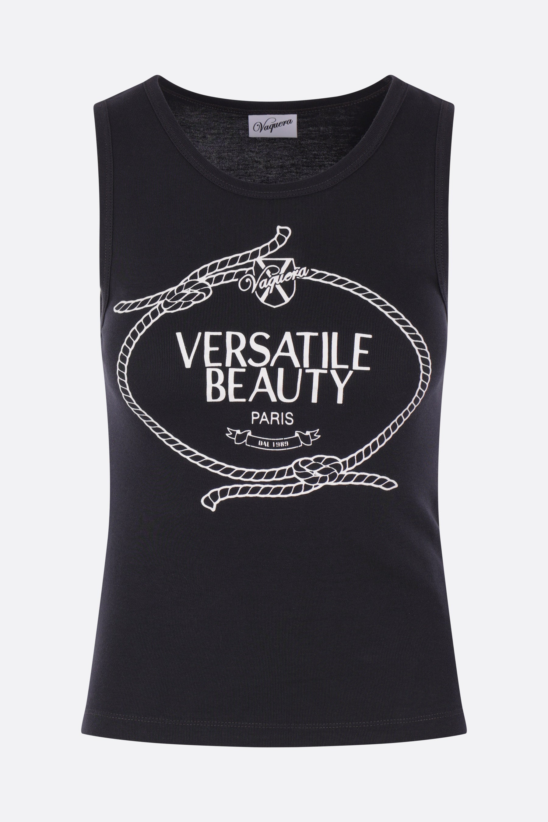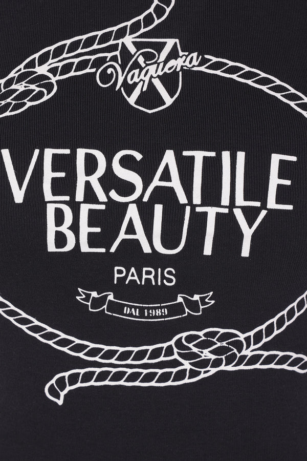Vaquera tank top crafted from black cotton jersey with a “Versatile Beauty” print on the front. Featuring a crew neckline and a straight hem.