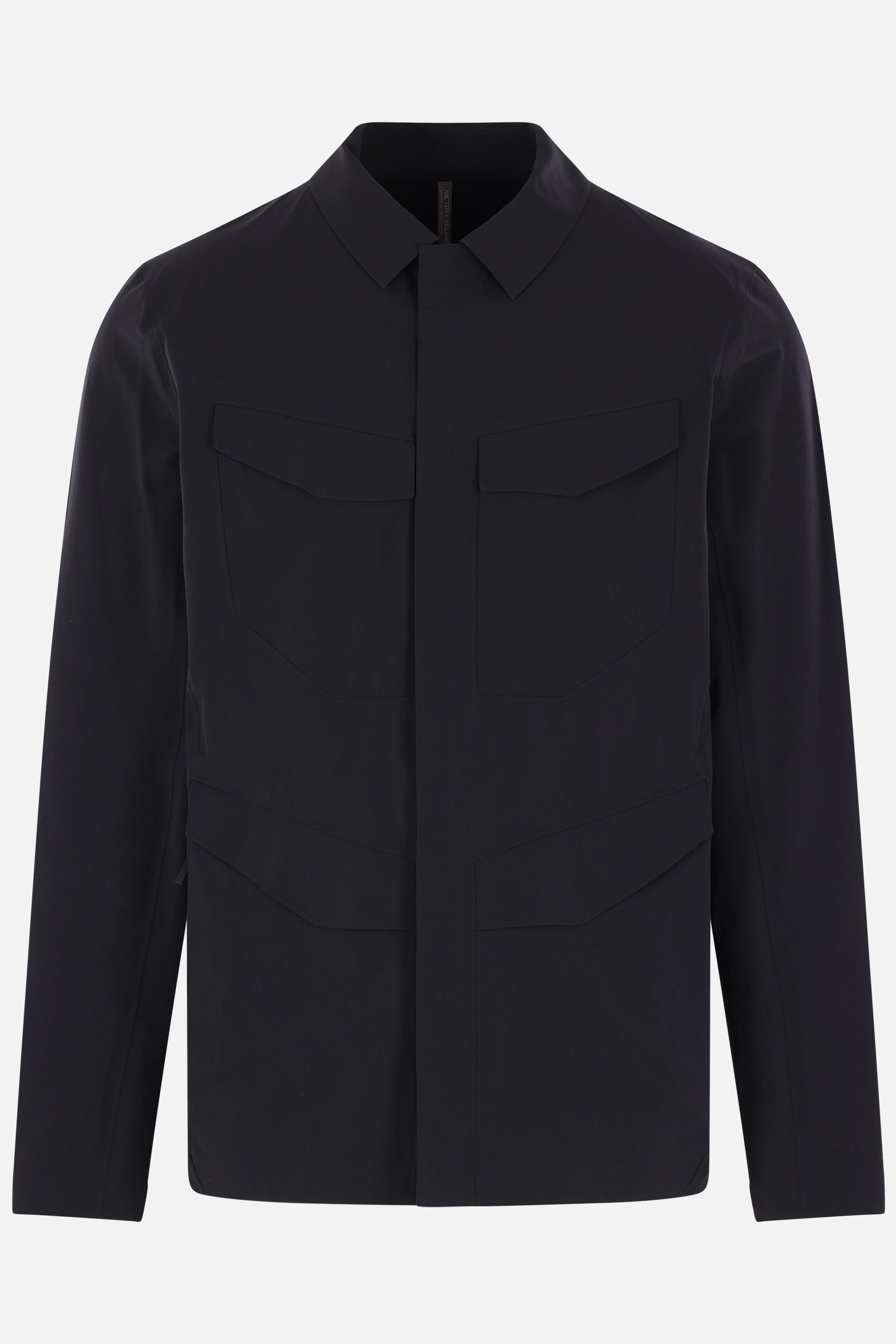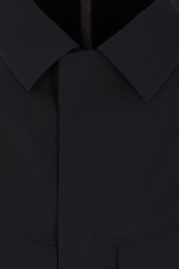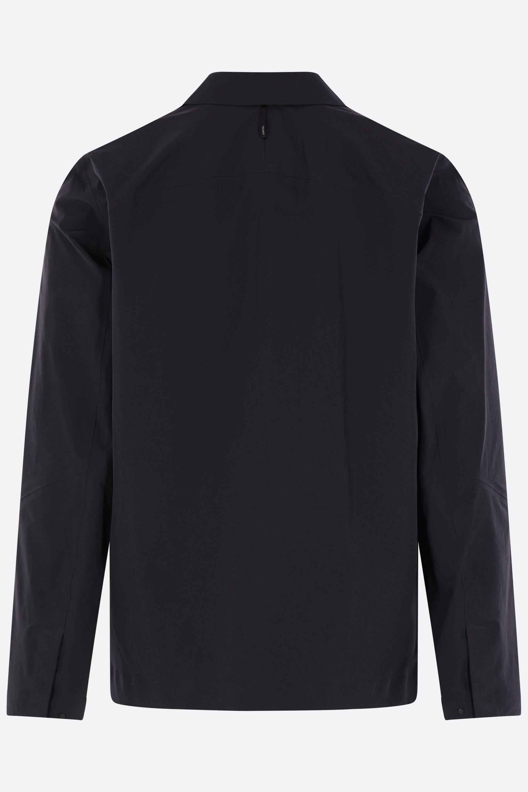 Veilance overshirt made from black stretch nylon. Features a pointed collar, front snap-button closure, multiple pockets, long sleeves with buttoned cuffs, and a straight hem. Unlined interior.