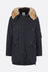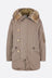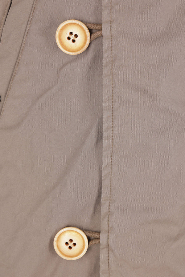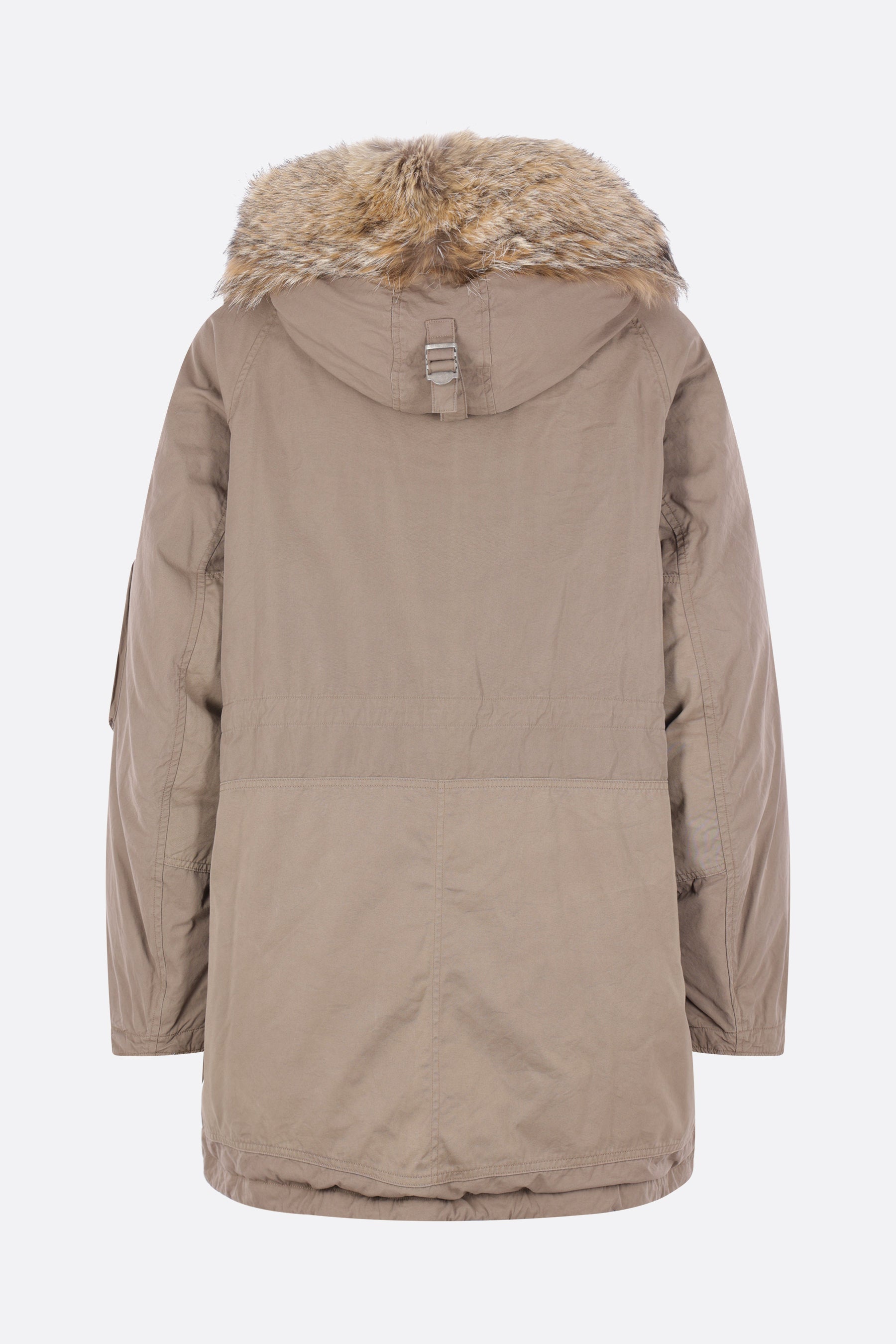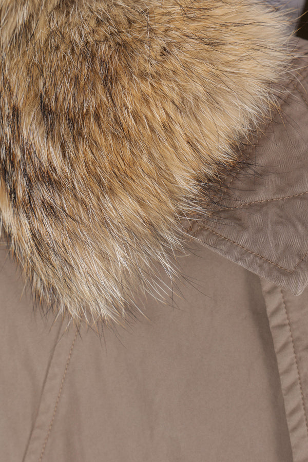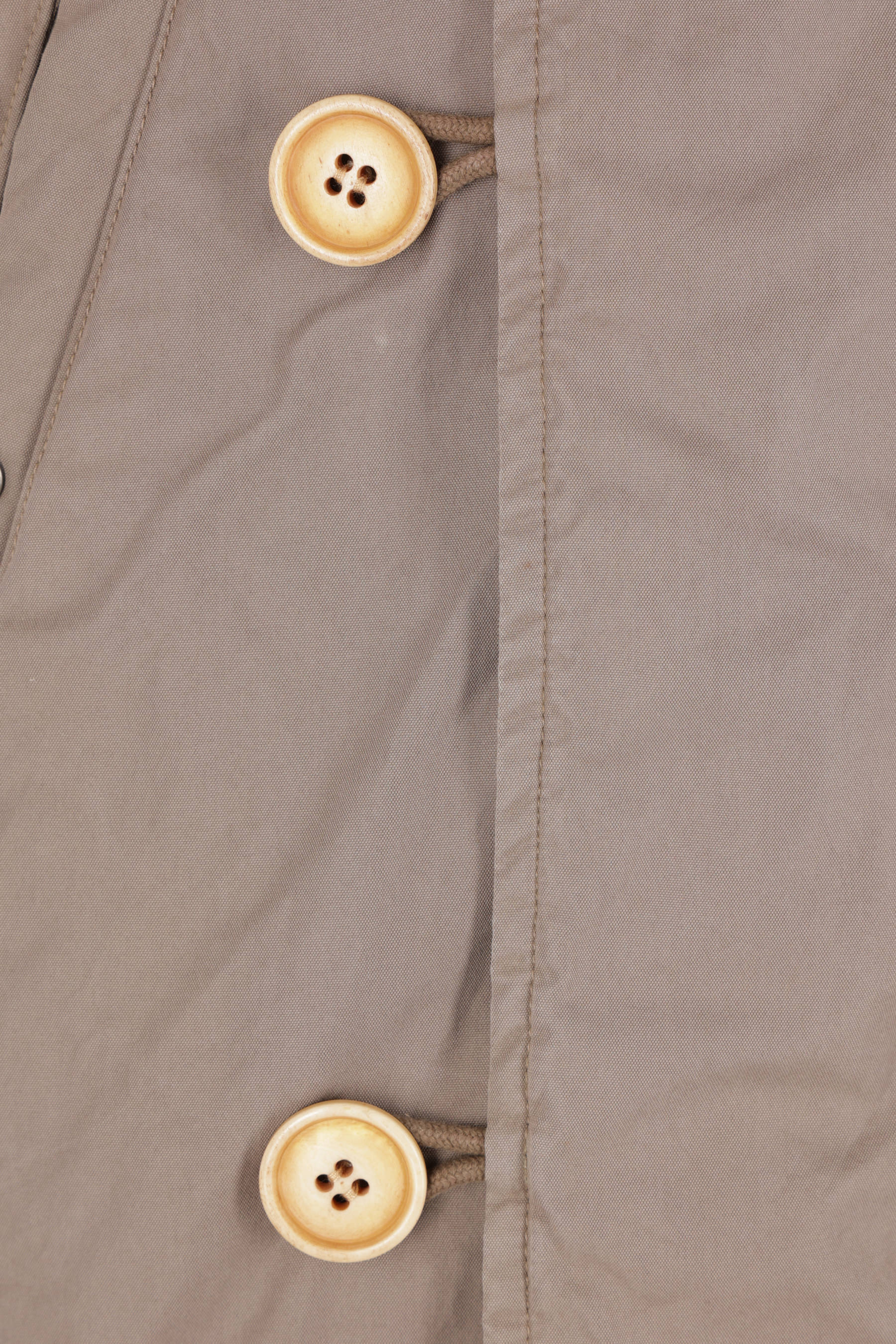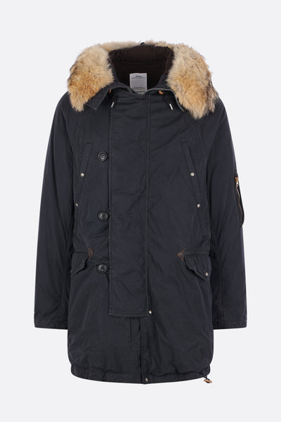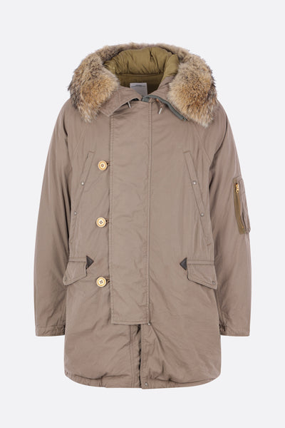 Visvim long down jacket crafted from khaki technical cotton. Featuring a high collar, hood with removable fur trim, front zip and button closure, multiple pockets, long sleeves with ribbed cuffs, and drawstrings at the waist and hem.