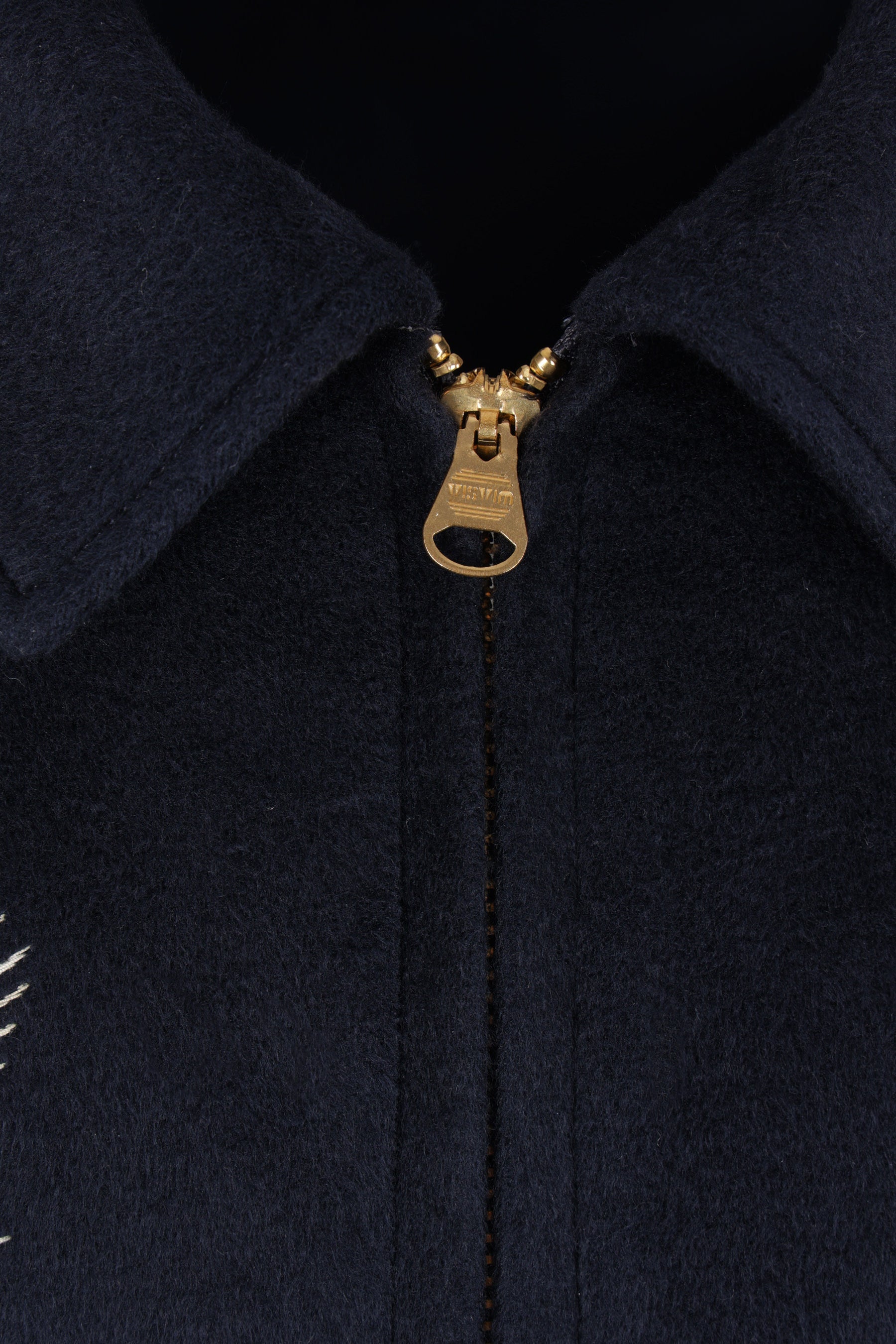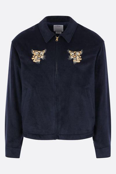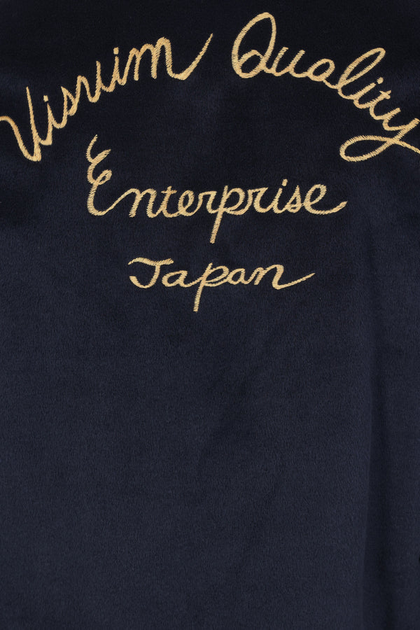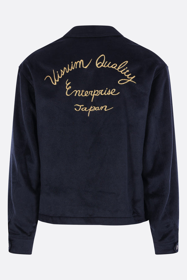 Visvim jacket crafted in blue silk with "Tora" and "Visvim Quality Enterprise Japan" embroidery. Features a pointed collar, front zip closure, welt pockets, long sleeves with buttoned cuffs, and a straight hem. Fully lined interior.