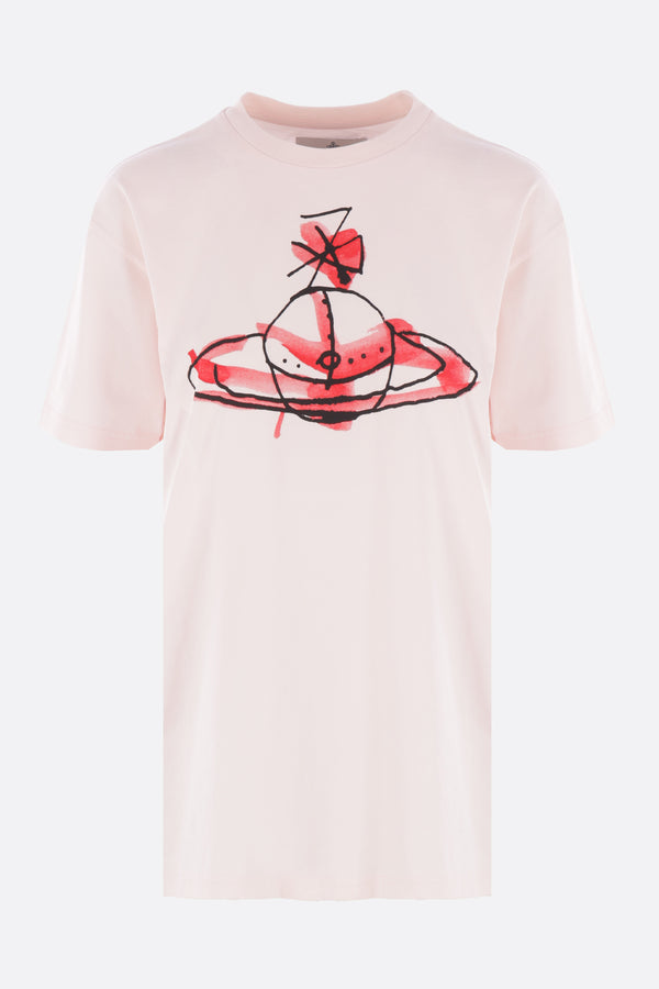 Vivienne Westwood t-shirt crafted from pink cotton jersey, featuring a Drawn Orb print on the chest. Designed with a crew neckline, short sleeves, and a straight hem.