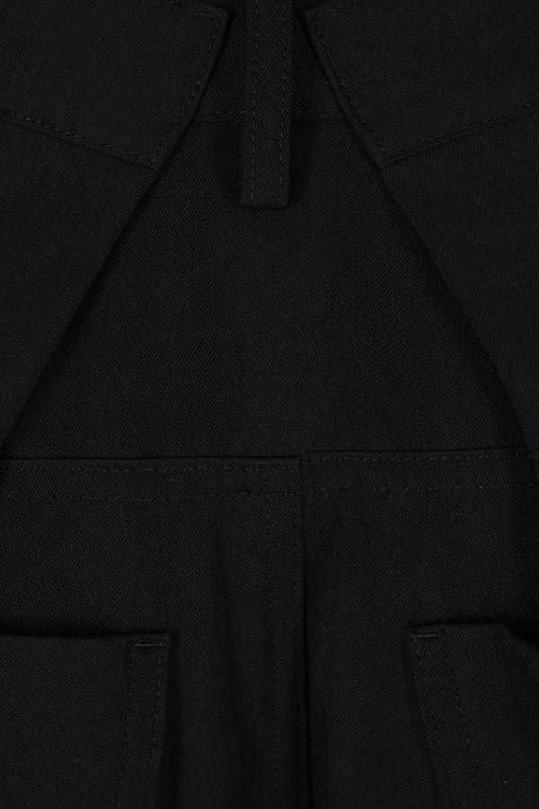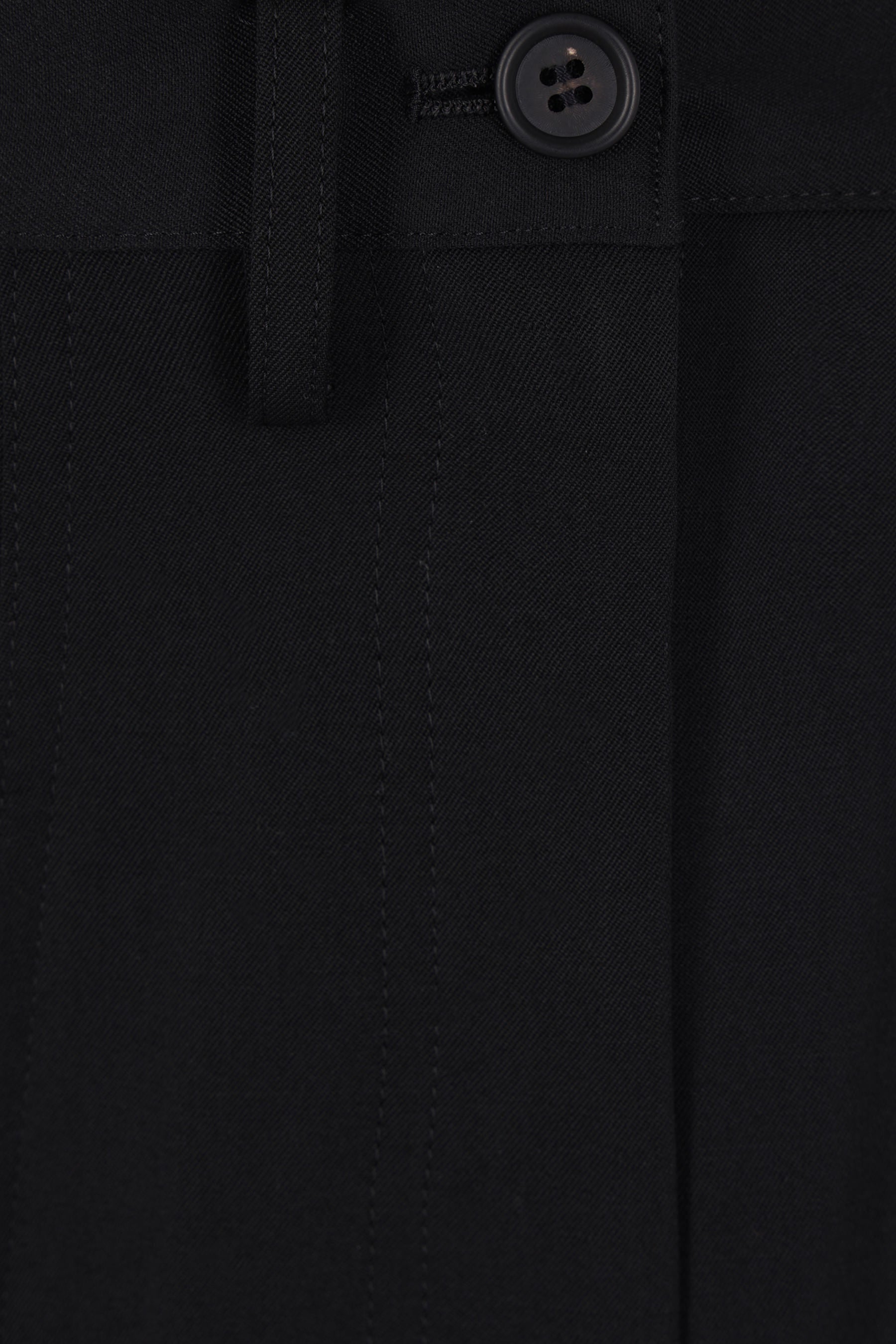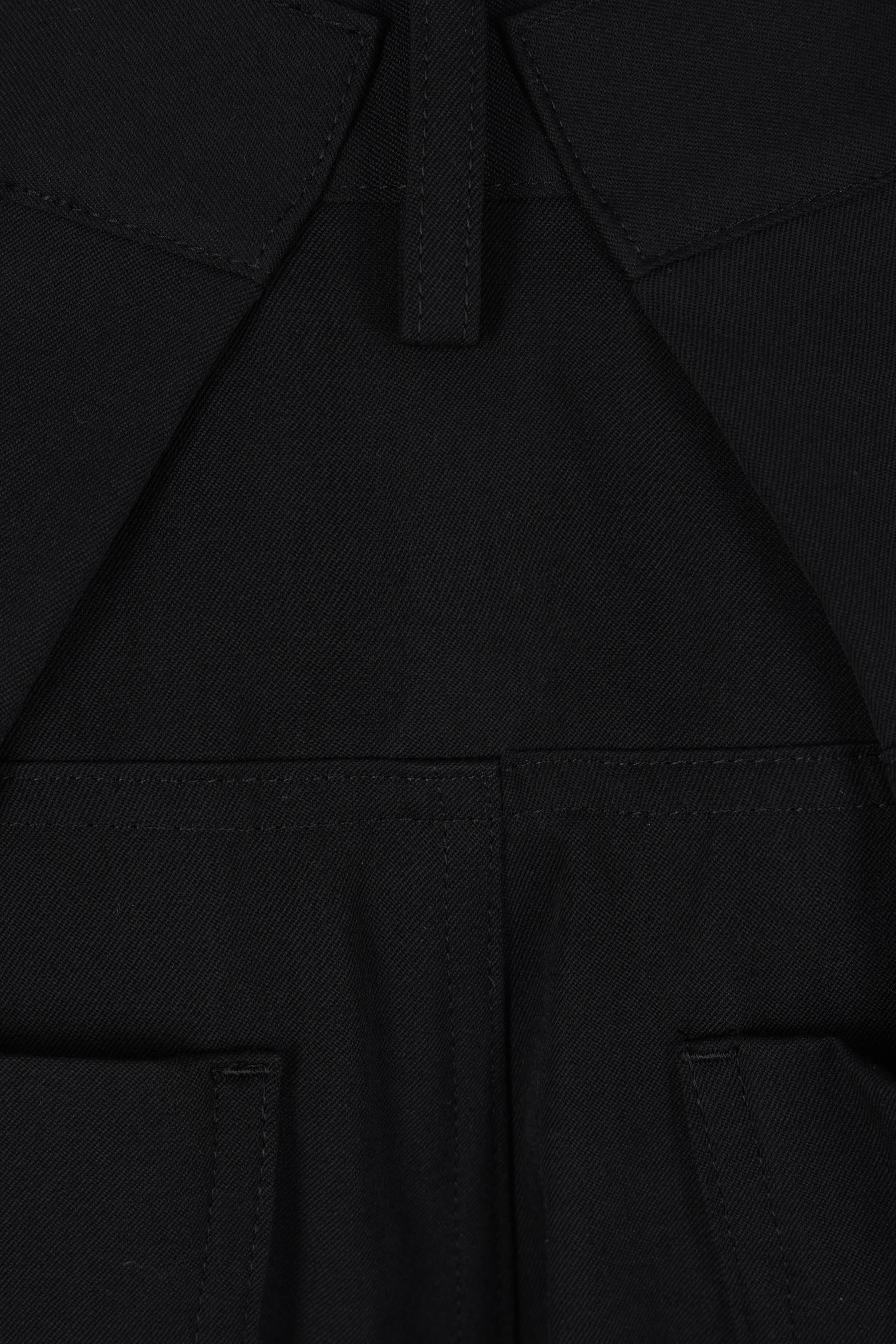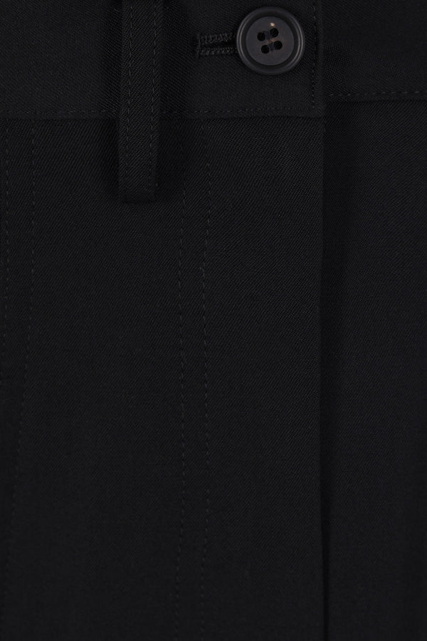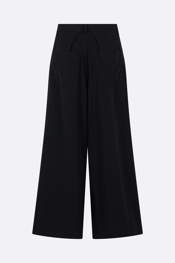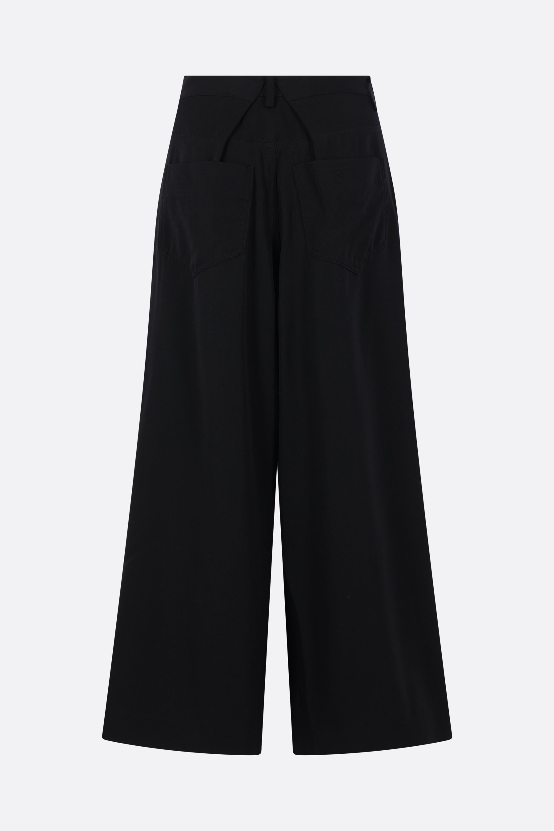 Yohji Yamamoto baggy trousers in black wool. Features an asymmetric closure with button and zip, belt loops, and multiple pockets.