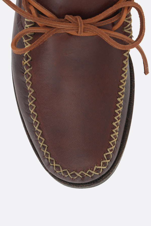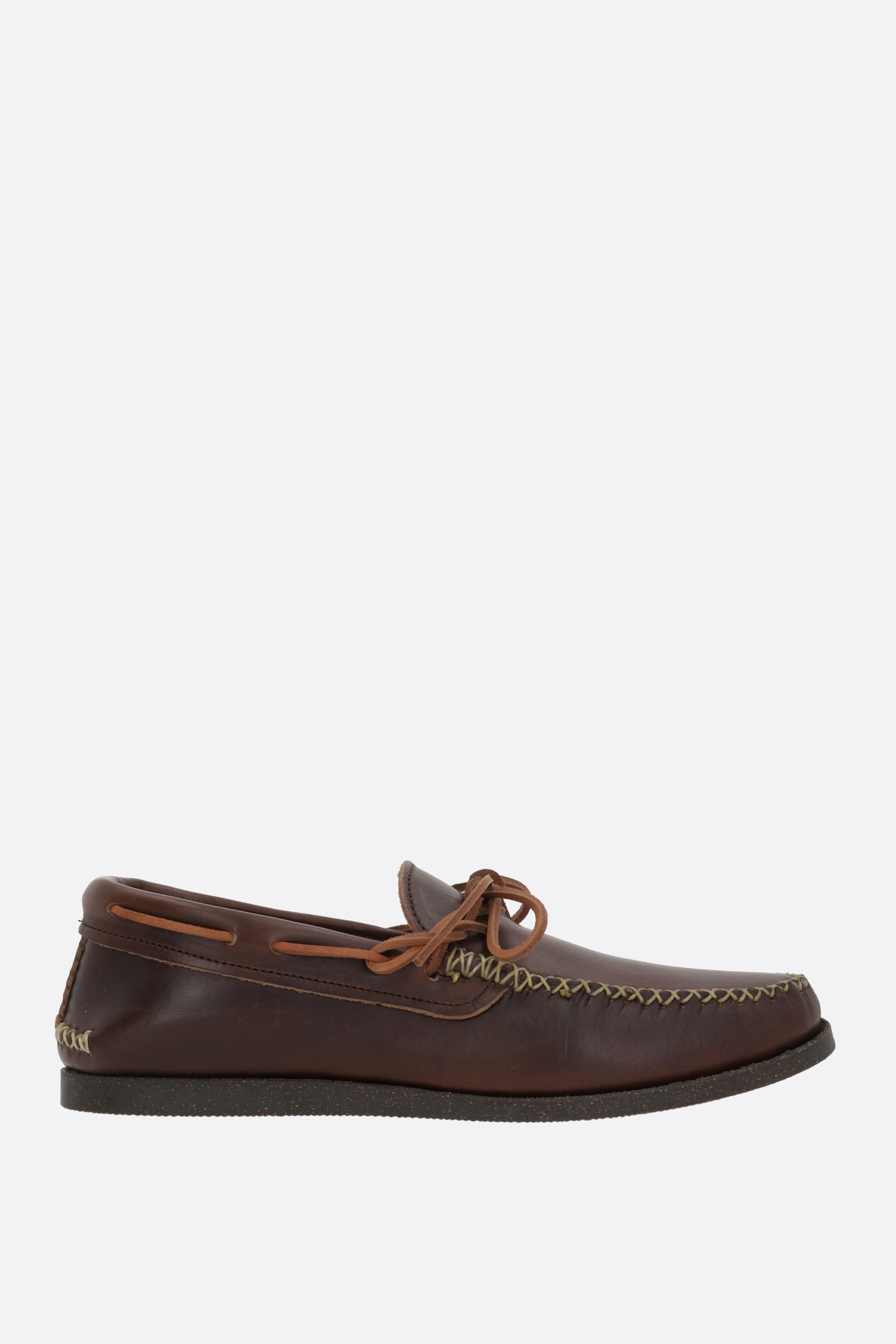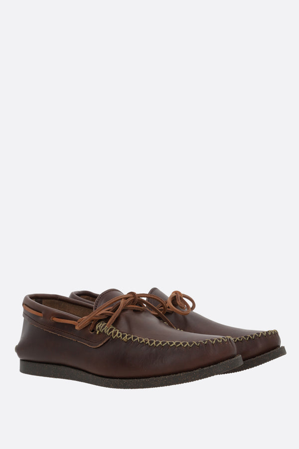 Yuketen boat shoes made of smooth brown leather. Featuring a lace-up closure, round toe, leather lining, and a rubber sole.